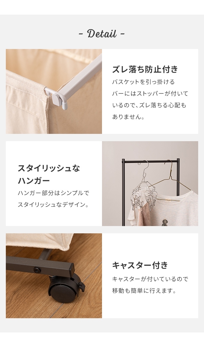 | 掛ける・収納するが同時にかなうシンプルなランドリーハンガー。 バスケットは取り出すことができ持ち運びも簡単。 キャスター付きなので移動も簡単。 バスケットは下段に2個。それぞれ独立して取り外し可能。 バスケットには取っ手が付いているので、持ち運び時にも便利。 バスケットを引っ掛けるバーにはストッパーが付いているので、ズレ落ちる心配なし。 ハンガー部分はシンプルでスタイリッシュなデザイン。 |