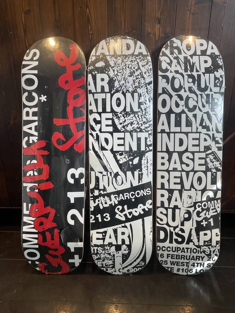 2007か8年頃青山コムデギャルソンにて購入のスケボーデッキになります。希少品になりますのでご理解いただける方とお取引よろしくお願いします。値引きは考えておりません。3枚セットでバラ売りは出来ません。
