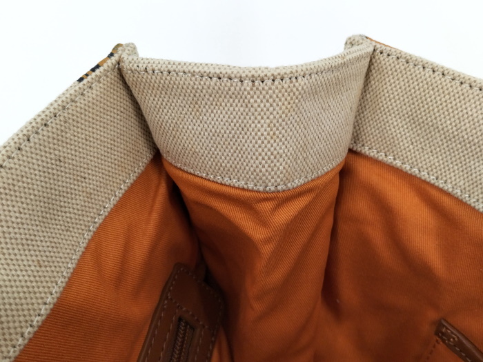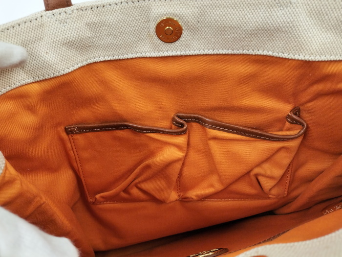| ◆商品情報 | ・カラー:ベージュ ・素材/ライン:キャンバス ・サイズ:最大約 W34×H34×D12(cm) ・ショルダーの長さ:最大約48(cm) ※多少の誤差はご了承下さい。 ・内側:ファスナーポケット×1 オープンポケット×2 |