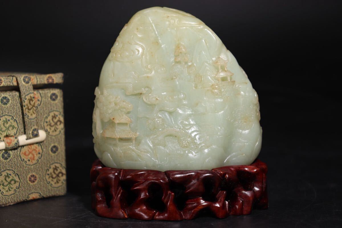 | 時代 砡 山水図 彫刻 唐木 台座 箱付 / 検索: 中国美術 清代 頃 石工芸 天然石 翡翠 和田玉 置物 .G1703 |