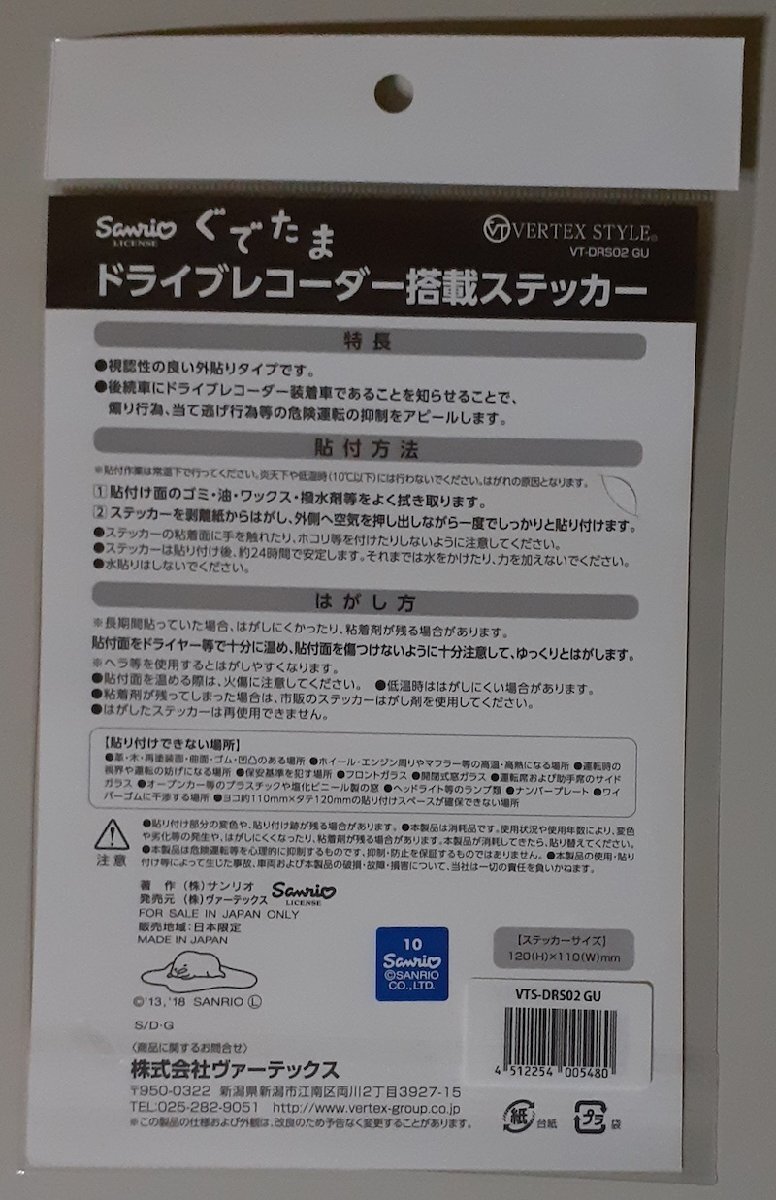 5857 未使用 VTS-DRS02GU ステッカー サンリオ ぐでたま ドライブレコーダー録画中 REC 危険運転の抑制に 当て逃げ対策に