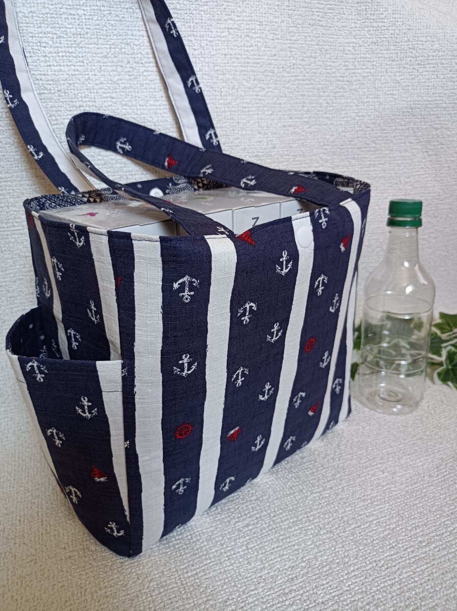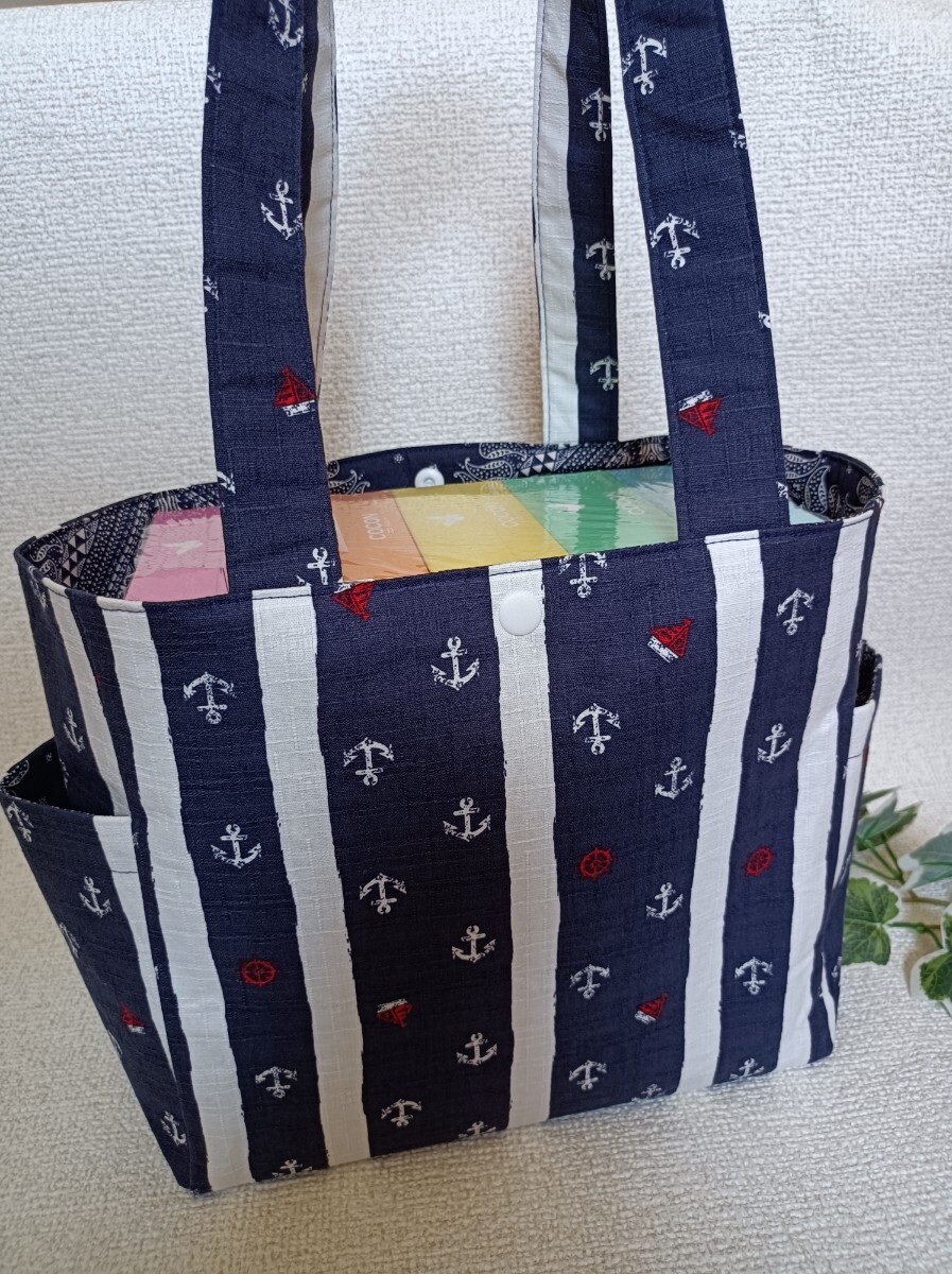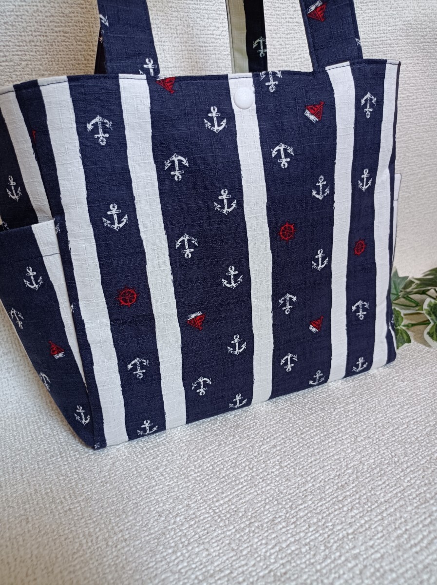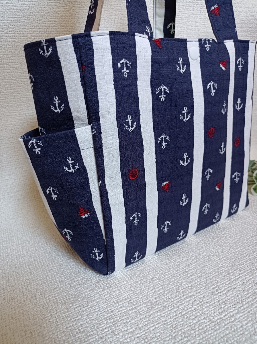ハンドメイド サイドポケット付きトートバッグ マリン いかり柄 肩掛け | |||