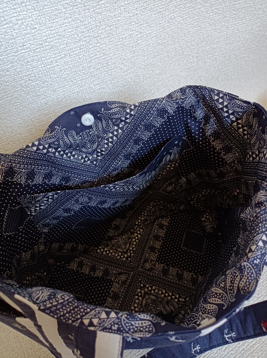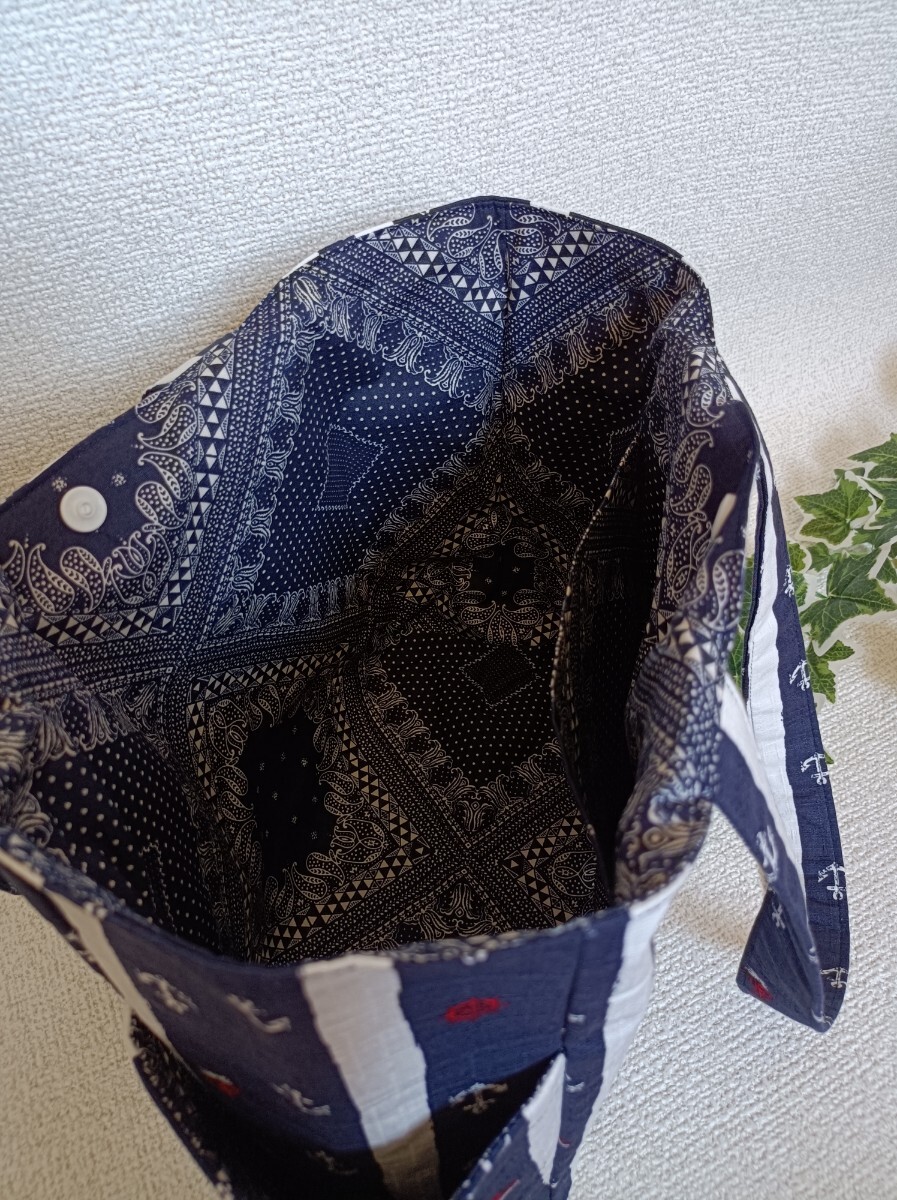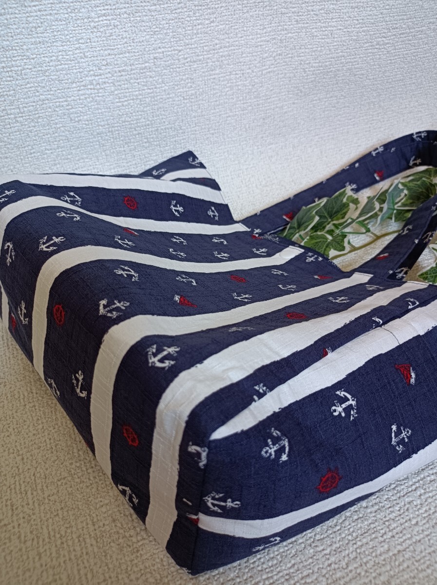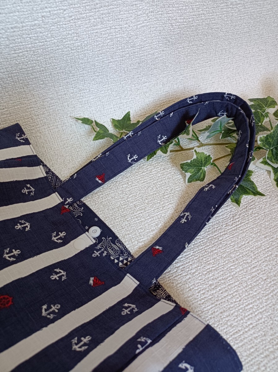 ハンドメイド サイドポケット付きトートバッグ マリン いかり柄 肩掛け | |||