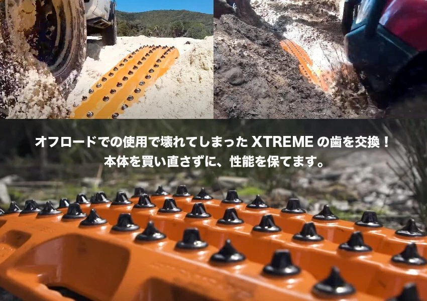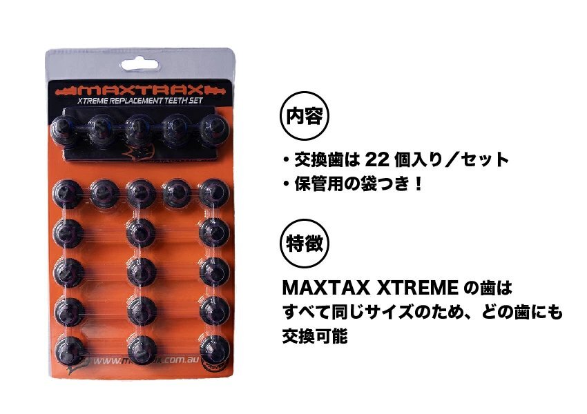 | 詳細 | 【商品詳細】 ■用途:MAXTRAX XTREMEの表面にある歯状突起の交換歯。 ■材質:硬質アルマイト合金 ■生産国:オーストラリア 【商品概要】 MAXTRAX XTREMEの表面にある歯状突起の交換歯。 MAXTRAX XTREMEの歯は、すべて同じ形状・サイズのためすべての歯に適合し、 損傷した歯を交換することができます。 ・22本入り/セット ・保管用の袋付き |