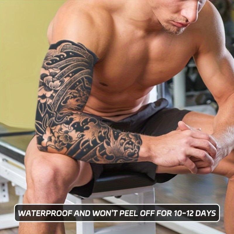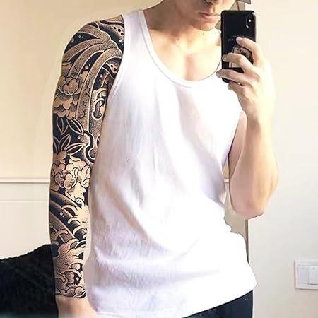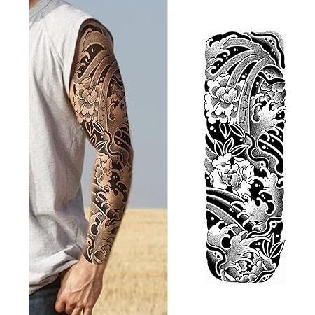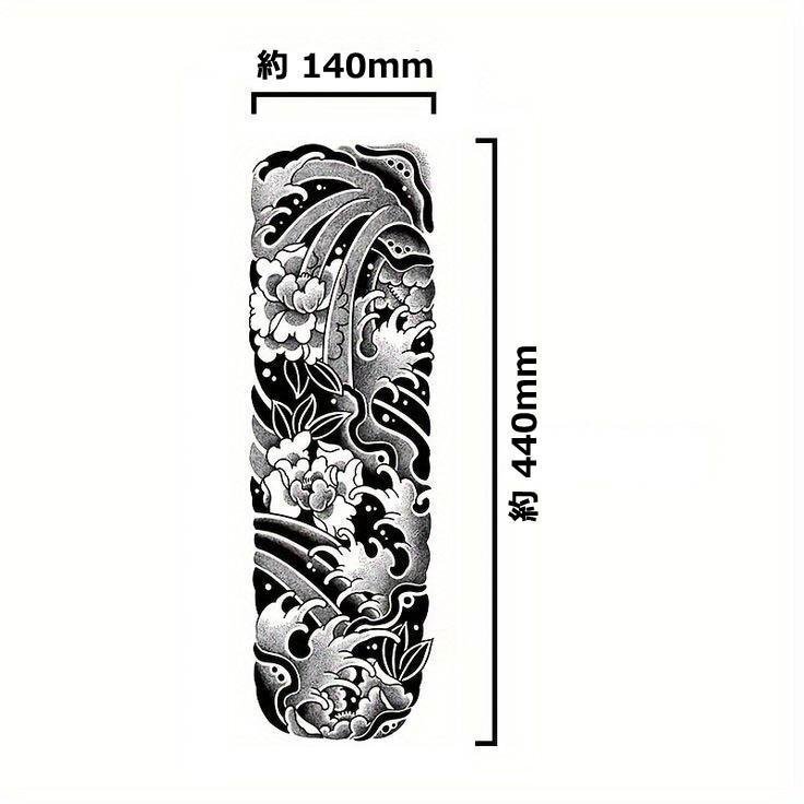 | 台紙サイズ 約 14cm×44cm 腕を覆うほどのサイズのタトゥーシールです。 ※敏感肌、目の近く、または接着剤にアレルギーがある場合は使用しないでください。 【使用方法】 ●透明フィルムを剥がし、スプレーまたは濡れタオルでステッカーをしっかりと濡らして下さい。 ●10秒間、肌に密着させ、ステッカーを剥がします。その後約2時間濡らさないで下さい。 ●約、6時間後に発色開始→約24~48時間程度で完全発色します。 ●約1~2週間持続します。 【貼る時のコツ】 シートそのままの大きさだと曲げ辛く密着しにくい為、余白部分を切ってから貼るのがコツです。 ※商品画像の色味は画面でみた場合と実際は多少の色差が生じる場合がございます。 ※海外製品のため入荷時点でしわや折れ目が付いている場合がございますが、ご使用には問題ございませんので予めご了承ください。
