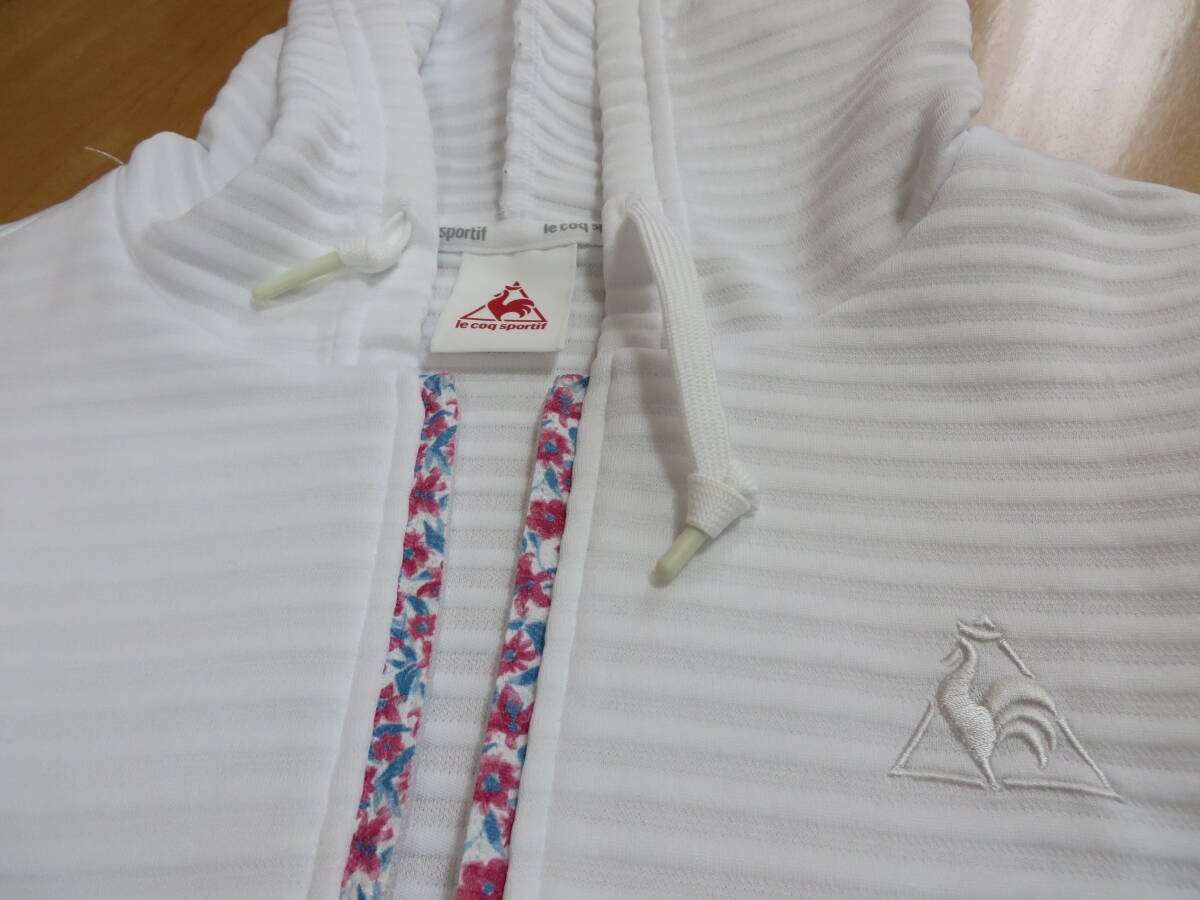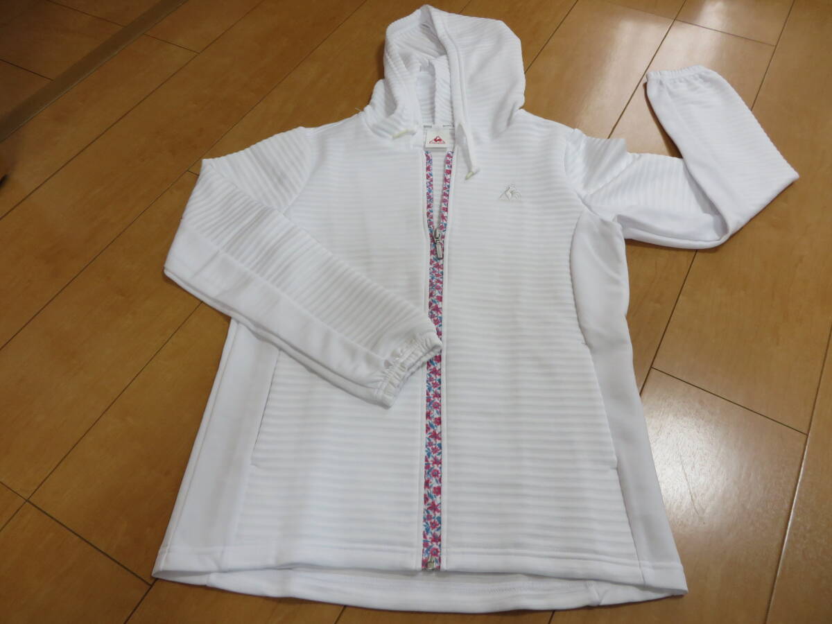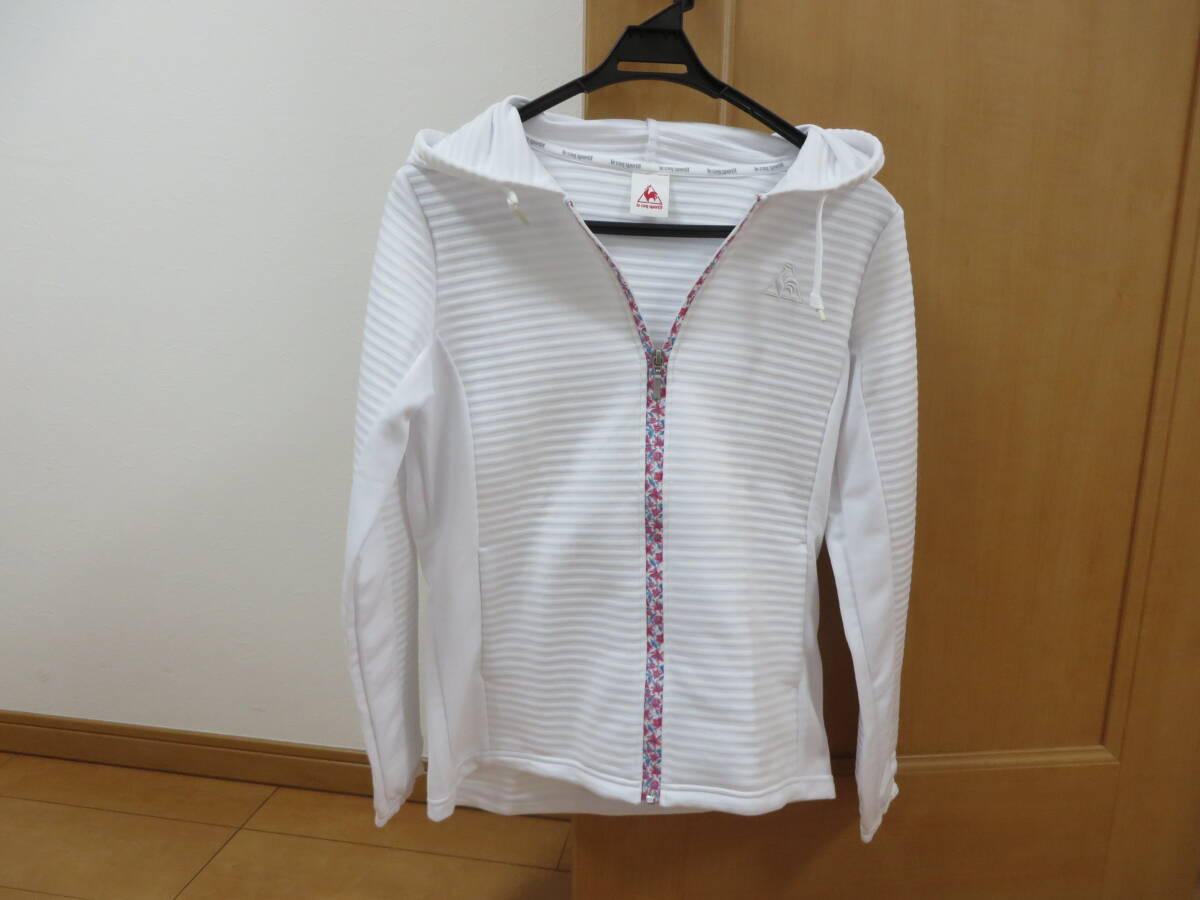ルコックゴルフのフード付きパーカーになります。お色は白地に花柄ステッチでサイズはSになります。2回程着用しただけの超美品になります。素人採寸になりますが、肩幅36cm、身幅43cm、着丈57cm、袖丈56(肩口から袖口まで)cmになります。両前ポケットが付いているのでとても便利です。これからのシーズンから寒くなる手前まで活躍してくれると思います。発送はレターパックプラスを予定。ノークレームノーリターンでお願い致します。