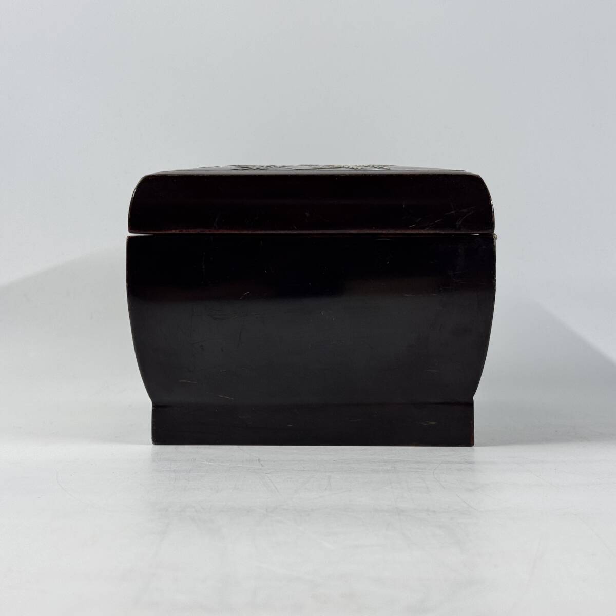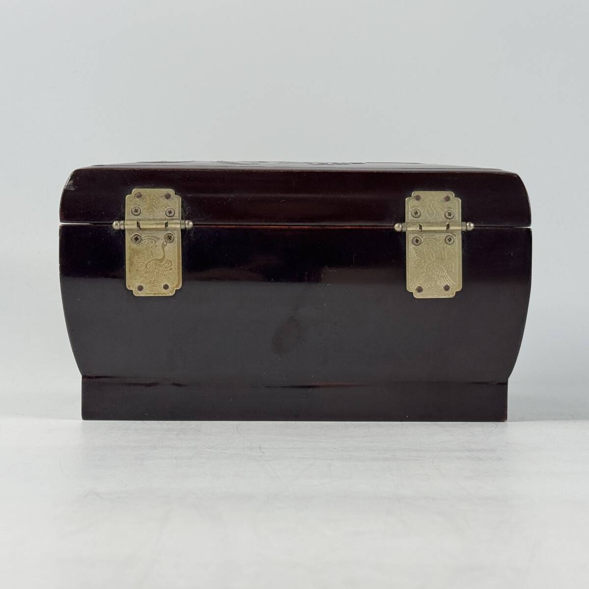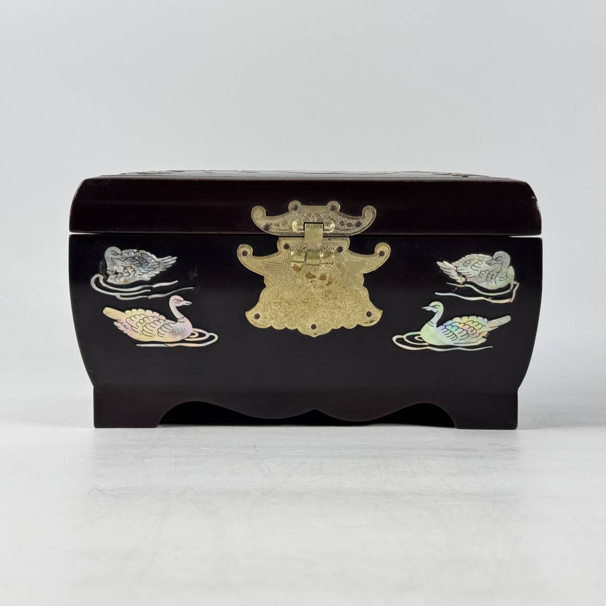 上部の螺鈿の一部に変色なのか?薄茶色の箇所が見られ、正面の左側の上部の水鳥の一部の螺鈿が剥落しています。