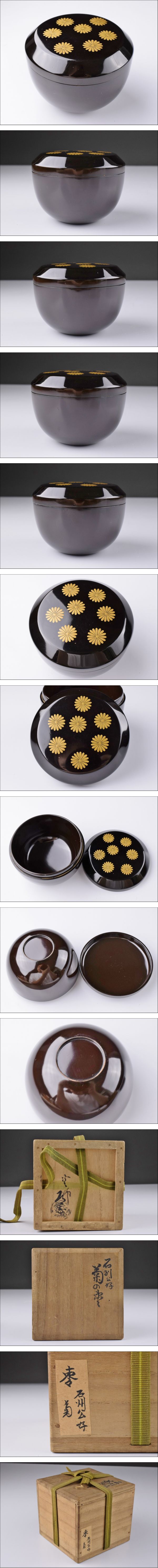 品 名:茶道具 在銘 石州公好 菊蒔絵 棗 共箱 寸 法:高さ 5.5㎝ 直径 7.5㎝ 総重量:51g 状 態:経年による汚れ、小傷、日焼あり。 | |||