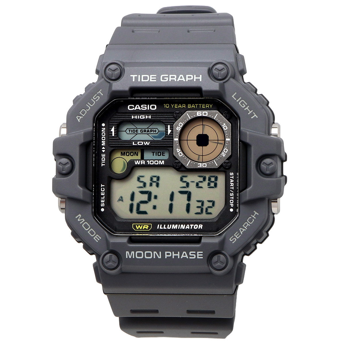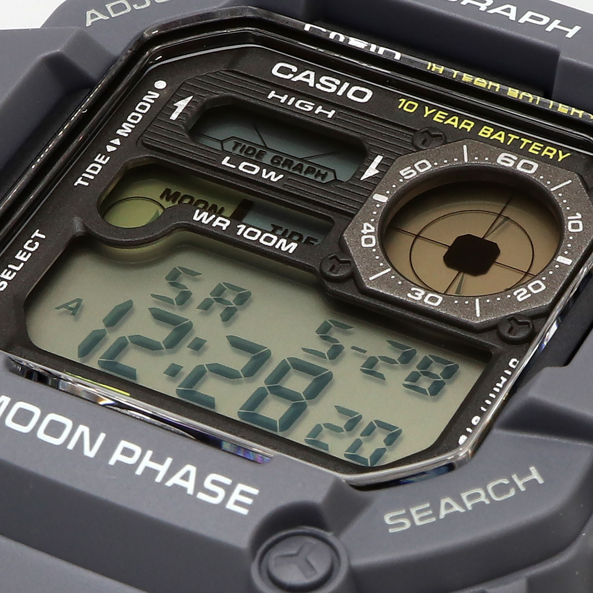 機能 | ●デュアルタイム●ムーンデータ(月齢・月の形表示)●タイドグラフ●ストップウオッチ(1/100秒、24時間計、スプリット付き)●タイマー(セット単位:1分、最大セット:24時間、1秒単位で計測、オートリピート)●マルチアラーム3本(1本のみスヌーズ機能付き)・時報●LEDバックライト(残照機能、残照時間切替(1.5秒/3秒)付き)、ライトカラーLED:アンバー●フルオートカレンダー●操作音ON/OFF切替機能●精度 平均月差:±30秒●12/24時間制表示切替 |