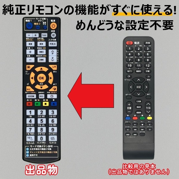 | 【商品名】 TEES LE-2412TS 代替リモコン 【対応機種】 LE-2412TS 用 比較画像の右側の純正リモコンが付属する機種に使用出来ます。 上記機種以外については、質問欄よりメーカーと型番をご連絡頂ければ、対応品のご案内をしております。 【商品について】 左側の代替リモコンが出品物になります。右側のリモコンは見本画像です。 タイトル機種のリモコン信号を入力した、設定不要で使える純正品と同等の代替リモコンです。 乾電池は付属しません。別途ご用意下さい。(単4乾電池×2本) 【商品サイズ】 縦18.5cm×横5cm×高さ2.35cm 【発送について】送料無料 迅速発送を心掛けております。土日祝日はお時間を頂く場合ございます。 ポスト投函配達となり、日時指定は出来ません。 | ||