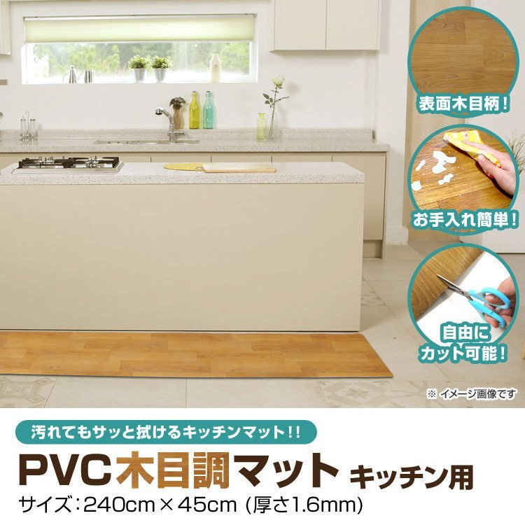 | キッチン周りの床面を傷や汚れから守るキッチンマットです。 インテリアのアクセントや床に馴染みもよいデザインで、お部屋のイメージを損ねない!! 耐熱性があるので床暖房の上でも使用OK! 240cmの大型サイズで簡単にカットすることができるので、ダイニングテーブルやカウンターのマットとしても最適です! 【商品仕様】 カラー:木目調 サイズ(約):幅240cm×奥行45cm(厚さ1.6mm) 重量(約):2.2kg 材質:PVC(ポリ塩化ビニール) 使用温度(約):−30℃〜70℃ ※お手入れは薄めた中性洗剤を湿らした布につけ、固く絞って拭いた後、水分が残らないように乾いた布で乾拭きしてください。 ※日の当たる所で使用しないでください。日焼けで硬化する場合があります。 |