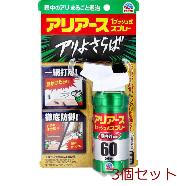 屋内のアリを1プッシュで速効退治&1ヵ月予防。 簡単にアリ予防。 1ヵ月に1度で簡単。 お部屋にアリがいなくなる。 ・窓のサッシ、ドアのすき間、壁と床のすき間など、アリが侵入しそうな場所にプッシュしておくだけで、アリのまちぶせ効果が約1ヵ月間続きます。 (使用環境により異なります) ・屋内にいる不快なアリを1プッシュで速効退治します。 ・アース独自のパワフルショットスプレー&三方広角噴射ノズルで、瞬時に薬剤が届きます。 ・ベタつきにくい処方なので、屋内で手軽にお使いいただけます。 ・ヒアリ、アカカミアリ、アルゼンチンアリにも効果があります。 【成分】 有効成分:プラレトリン、ビフェントリン、ピレトリン 【適用害虫】 クロヤマアリ、クロオオアリ、トビイロシワアリ、ルリアリ、トビイロケアリ、アミメアリ、オオズアリ、オオハリアリ、ヒメアリ、クロクサアリ、羽アリ、アカカミアリ、アルゼンチンアリ、ヒアリ、ハヤトゲフシアリ 【使用方法】 ・初めて使用する際は十分な量が出ないので、2回程度屋外に向かってカラ押ししてから使用してください。 ★アリが侵入してきそうな場所に使用する場合 ・20cm×50cmに1プッシュの割合で噴射する。 ★アリに直接噴射する場合 ・アリに30cm以内の距離から、1プッシュ噴射する。 ※注意:人体に使用しないでください ※肌にスプレーする虫よけ剤ではありません。 個装サイズ:125X210X50mm 個装重量:約112g 内容量:80mL 製造国:日本 【発売元:アース製薬株式会社】 【注意】 ・必要に応じて読めるよう、製品表示を保管しておくこと。 ★使用上の注意 ・定められた使用方法を守ること。 ・噴射前に噴射口の方向をよく確認して、薬剤が顔などにかからないようにすること。 ・人体用虫よけ剤(塗布型忌避剤)ではないので、人体には使用しないこと。 ・人体に向かって噴射しないこと。 ・薬剤を吸い込まないこと。 ・万一、身体に異常が起きた場合は、できるだけ本品を持って直ちに本品がピレスロイド系薬剤を含む商品であることを医師に告げて診療を受けること。 ・噴射中に、薬剤が皮膚や目にかからないように注意すること。 ・薬剤が皮膚に付いたときは、石けん水でよく洗い、目に入ったときは、直ちに水でよく洗い流すこと。 ・アレルギー症状やかぶれを起こしやすい体質の人は、薬剤に触れたり、吸い込んだりしないようにすること。 ・噴射口をふさがないこと。 ・噴射できなくなることがあるので、逆さま、または真横にして噴射はしないこと。 ・残量が少なくなった場合、十分に薬剤が噴射されなくなることがある。 ・飲食物、食器、飼料、おもちゃ、観賞魚・小鳥などのペット類、観賞植物などにかからないようにすること。 特に観賞魚等の水槽や昆虫の飼育カゴがある部屋では使用しないこと。 ・シミになる恐れがあるので1ヵ所に集中してスプレーしないこと。 ・ワックス加工面、塗装面、プラスチック、革製品にかからないようにすること。 ・壁や床、扉などに使用する場合、変色、シミの恐れがあるので、目立たない所で試し状態を確認してから使用すること。 ・子供には使用させないこと。 ・閉め切った部屋や狭い部屋で使用する場合は、部屋の換気をすること。 ★保管及び取扱上の注意 ・子供の手の届かない所に保管すること。 ・直射日光や火気を避け、涼しい場所に保管すること。 ・缶のさびを防ぐため、水回りや湿気の多い場所には置かないこと。 ・暖房器具(ファンヒーター等)や加熱源の周囲、夏場の車内は温度が上がり破裂する危険があるので置かないこと。 注意事項 予告なく成分・パッケージが変更になることがございます。 予めご了承ください。 *予告なく成分・パッケージが変更になることがございます。予めご了承ください *ダンボールを使用して発送する場合には、入数以下の個数の場合、 中古ダンボールを使用する場合があり、ご注文の商品とは異なるダンボールになる場合があります。 あらかじめ、ご了承ください。 |