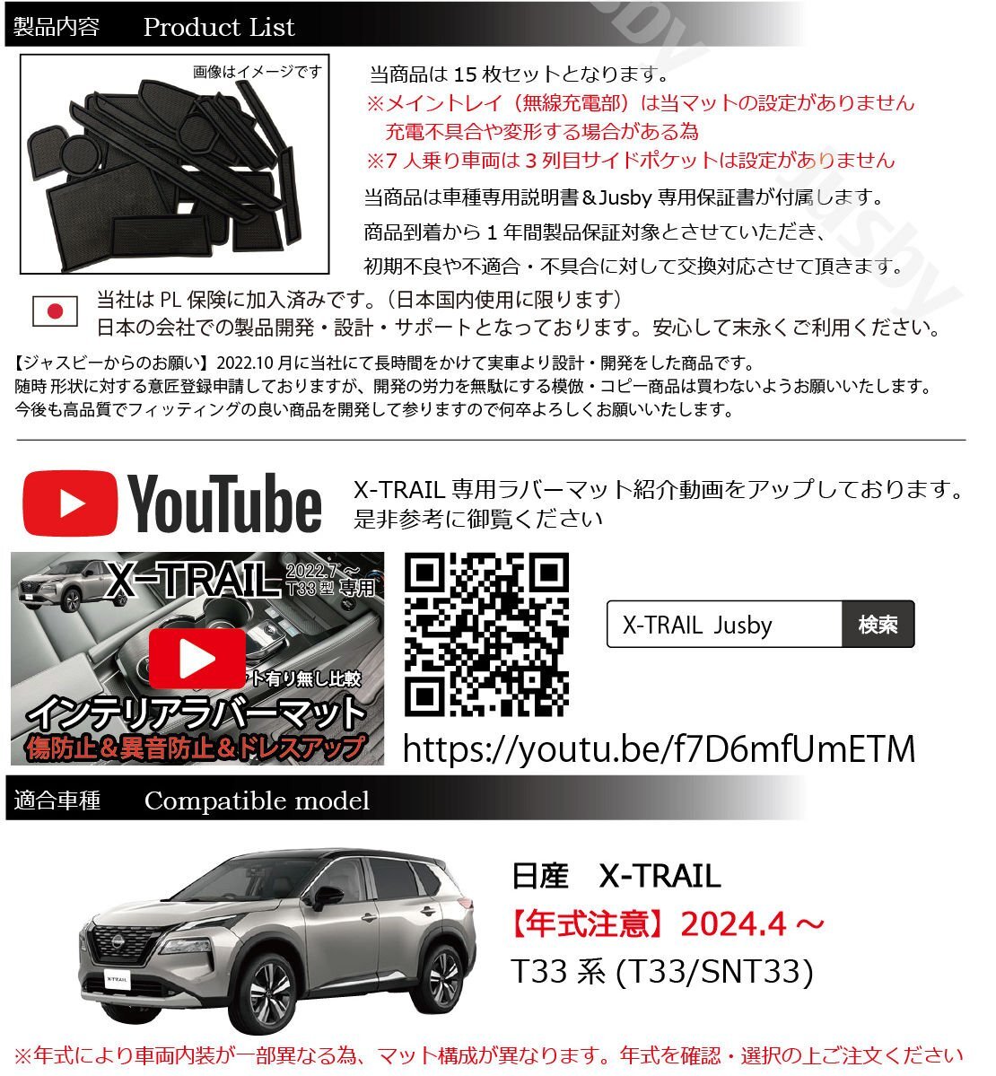 | 日産エクストレイル(X-TRAIL) T33系 【2024年4月~】 専用ラバーマット(ブラック/黒)になります。 日産 エクストレイル用インテリアラバーマット全15枚セットです。 車種専用設計で内装にフィットします。スマートフォン等を置く場合等運転中のカタカタ音の防止やパネルへの傷防止、ドレスアップに最適です。 純正ドアポケット部等プラスチック部が露出している場所を当Jusby製マットで質感をアップできます。 車内が静かな事もあり小物が動いた際などパネルと干渉・異音等が発生しやすい為是非当マットで保護&ドレスアップをお勧めいたします。 別途You TubeにてX-TRAIL専用ラバーマットの商品紹介動画もアップしておりますので是非参考にご覧ください。 【ご注意】 2024年4月に内装の一部が変更となっております。年式を商品タイトルにて確認の上ご注文をお願いいたします。 (カラーと年式は落札後に変更は出来ませんのでご注意ください) メイントレイ部及び7人乗り車両は3列目は当マットの適合がありません(要画像注意事項参照) 当商品には車種専用の取付説明書とJusby専用の製品保証書が必ず付属いたします。 PL保険(製造物賠償責任保険)付きです。1年間は不具合・不適合・初期不良に対しての製品保証を行いますのでご安心してお買い求めください。 スタッフレビュー 専用設計なのでフィッティングがとにかく良く、純正の様に見えます。 携帯電話等車で充電しながらそのまま置いていた部分にもラバーマットで保護できる為、携帯電話及び車両パネルにも優し満足度が高い逸品です。ホコリやゴミが溜まりやすいポケット部も丸洗いできるゴムマットで清潔に保てますのでお薦めです。 Jusby設計・開発のオリジナル商品です。デッドコピー防止の為、意匠登録申請済みです。(特許庁HPにてご確認ください)デッドコピーには「業者」及びコピー目的での購入者「個人」へ請求させていただきます。(Design PATENT by Jusby) |