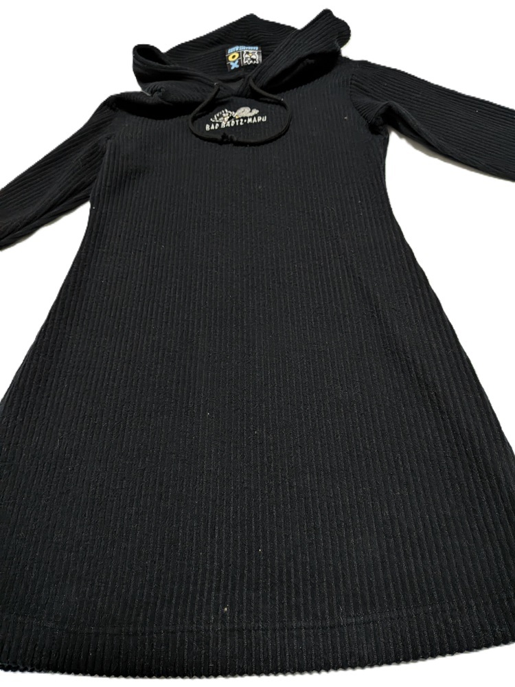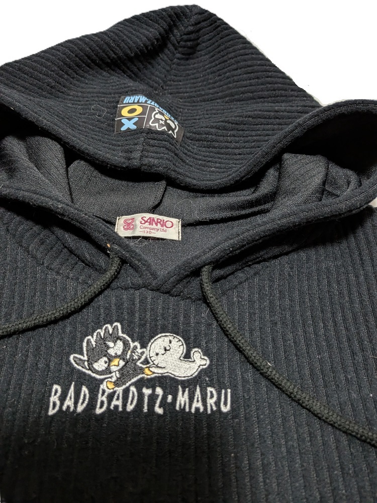 | カラー黒。 サイズは130。 身長125~135。 着丈約68cm。 肩幅約32cm・ 胸囲平置き半面約36cm。 袖丈(脇下から)約36cm。 袖幅半面約16cm・ 腕半面約9cm。 裾幅半身約47cm 素材はアクリル55%・ ポリエステル45%。 多少、素材落ちあります。 帽子、取り外しできません。 |