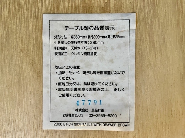 美品■MUJI/無印良品 バーチ(カバザクラ)材 天然木 ベッドサイド/サイドテーブル 廃盤品■引出し付き/ブラウン