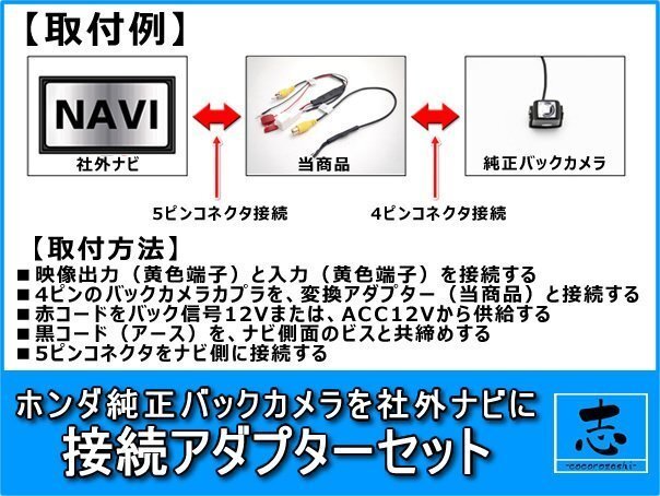 | ■純正バックカメラを社外ナビで流用 ホンダ純正メーカーオプションナビ・ディーラーオプションナビで使用しているメーカー純正バックカメラを社外ナビで使用することが出来ますので、カーナビ買い替え時等に最適です。 ■RCAビデオ端子のバックカメラ入力をもつカーナビゲーション等に対応 変換された端子は、RCAビデオ端子になりますので、RCAビデオ端子に対応したカーナビゲーションや液晶モニターへの接続が可能です。 |