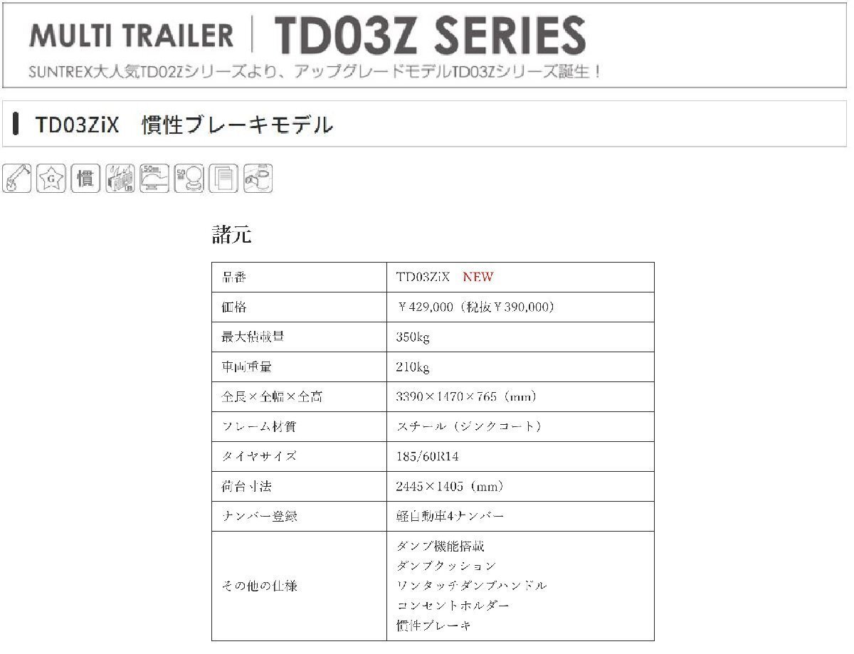 TD03ZiX 慣性ブレーキを搭載、軽自動車でも牽引可能なマルチトレーラー LEDテールランプ標準装備! ■荷台寸法:2445×1405(mm) メーカーHP DA |