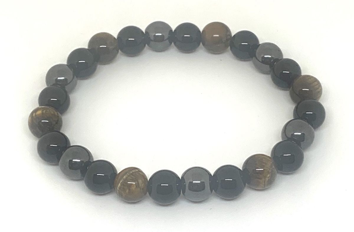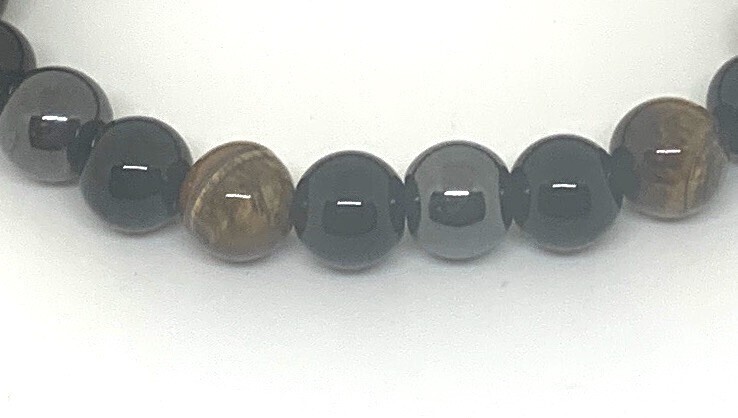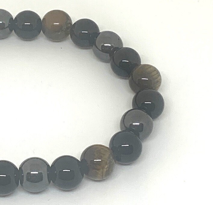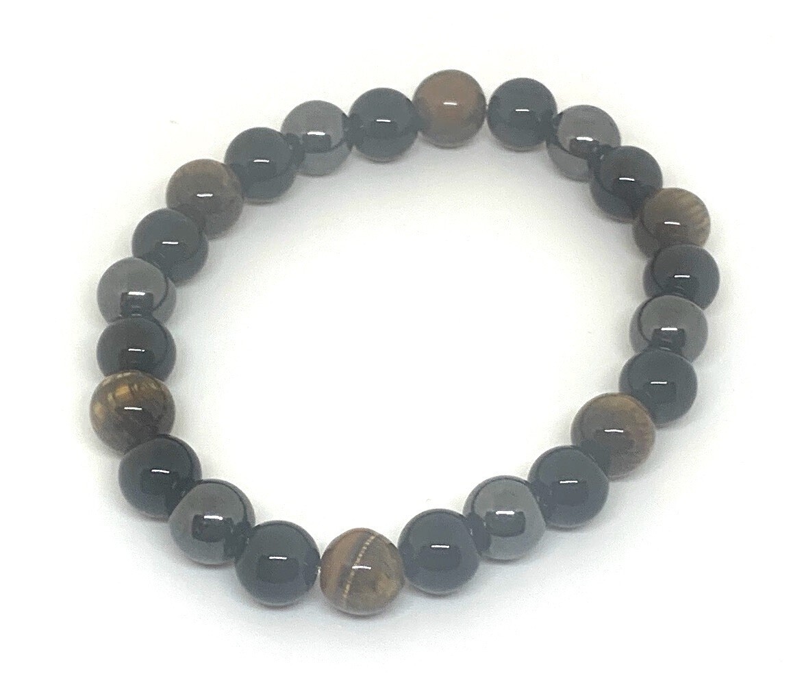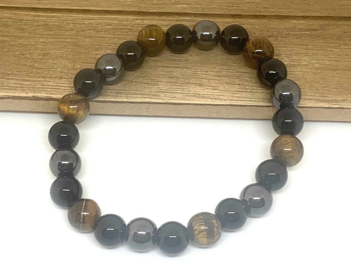タイガーアイ5珠、磁性ヘマタイト6珠、黒曜石11珠のアンサンブルブレスレットです(写真と数は違います)。タイガーアイは五芒の配置になっています。タイガーアイは全てを見通せる英知を支えるパワーストーンです。また黒曜石(オブシディアン)の石言葉は「悪しき習慣を断つ」「ネガティブな思考を変革する」「悪縁を切る」「決断力」などです。変革を意味するポジティブな言葉がずらりと並びます。また古来より厄除の守護石として重用されてきた歴史もあります。ヘマタイトは磁性を帯びていて、血流の改善などに効果があるという報告があります。手首周囲15.5センチまでの方に。| 出价者 | 信用 | 价格 | 时间 |