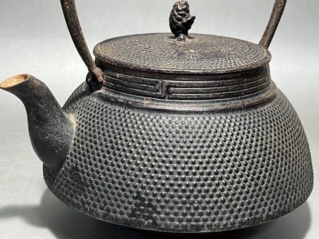 オークションをご覧いただきありがとうございます。 南部盛岡 松の実摘 霰紋 鉄瓶 茶道具 煎茶道具 伝統工芸 南部鉄器 農協共済記念 昭和32年度共済農協連 サイズ 高さ約11㎝(持ち手は除く) 径約18㎝ (注口は除く) 重さ1785gほど 内側に錆は見られますが、水漏れはありません。 現状でのお渡しになります。 写真をご参照ください。 落札後の返品はお受けできません。 |