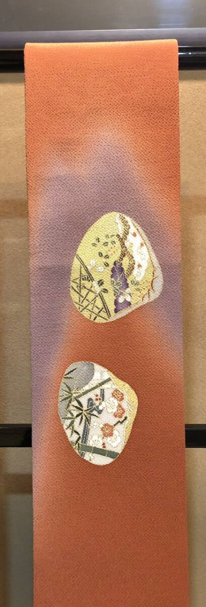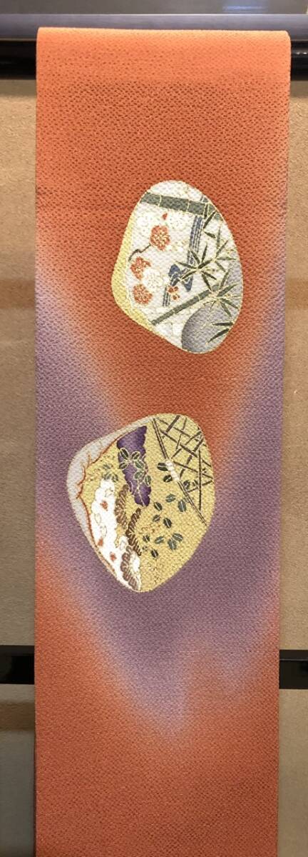 お仕立て上り品です。ズバリ 伝統工芸(本糊糸目の本友禅仕上げ)の粋を纏め上げた浜縮緬の9寸名古屋染帯の逸品です。琳派調の重厚感のある松竹梅と青海波、春秋にお締め頂けるよう紅葉・萩・菊をお太鼓とお腹の柄に植え付けポイントを京縫い(平糸のべたと金駒)で括りバックを本金砂子で重厚感と豪華さを醸し出して陰陽を付けました。とにかく袋帯に負けない9寸名古屋帯の最高峰の逸品の伝統工芸品です。無地感のお着物、小紋、付下、等にお締め頂ければ本望です。| 出价者 | 信用 | 价格 | 时间 |