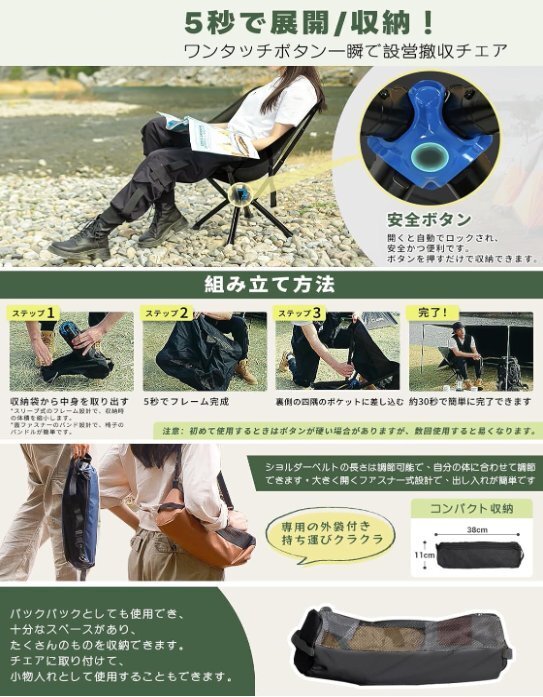 【快適な体験】:このキャンプチェアの展開サイズは60*54*68CMで、他の椅子よりも大きくて高い、自由に体を伸ばすことができます。さらに、座面の素材は綿で、他のチェアよりも暖かくソフトな座り心地で、冬場の使用にも適しています。| 出价者 | 信用 | 价格 | 时间 |