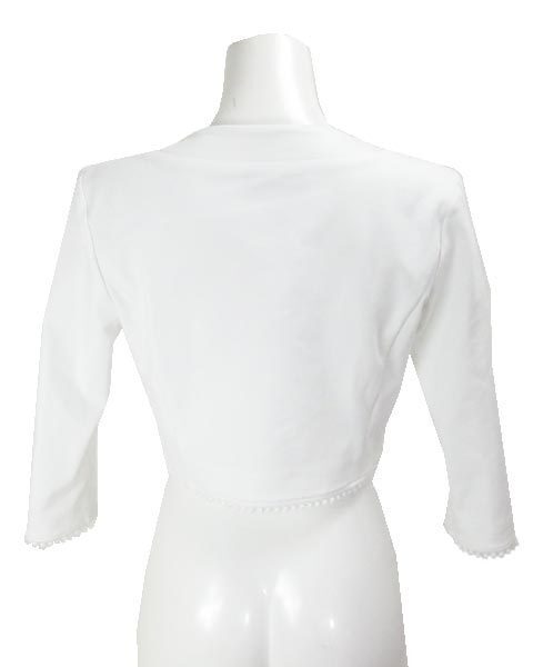 | きちんと感のある上品なボレロ。ややしっかり目生地で空調の効いた場所や春先、秋口に活躍してくれます。甘目ワンピースやスカート、クールなパンツまで幅広くコーディネートしていただけます。重宝すること間違いなしです。裏地はありません。 |
