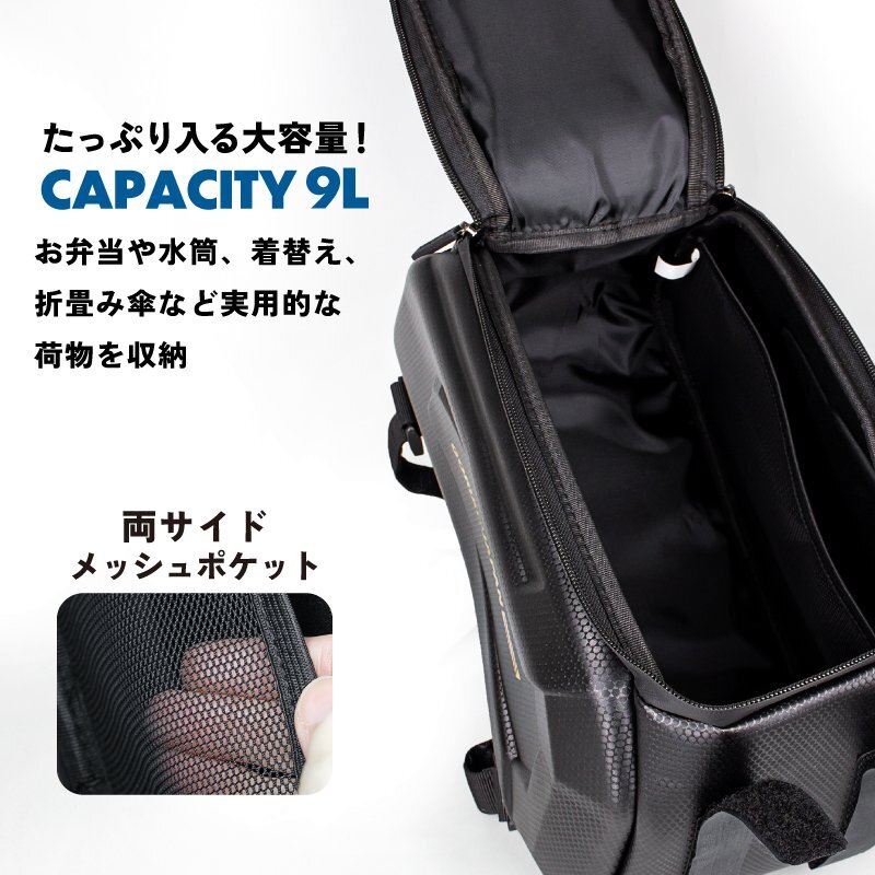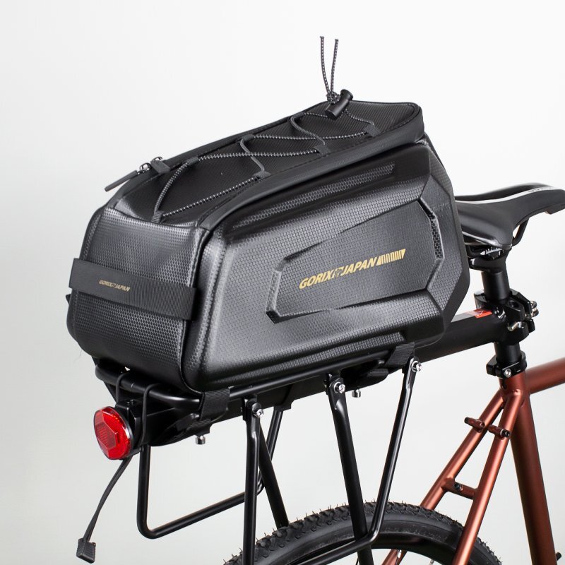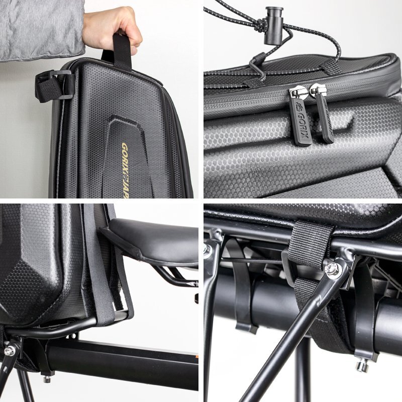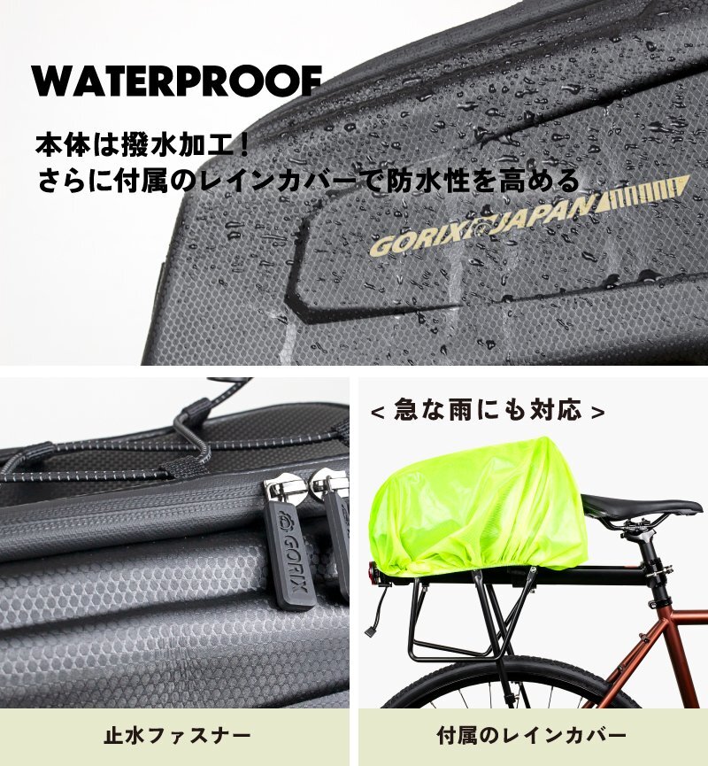GORIX Mayaキャリアバッグ 凹凸立体的なデザインで本体はハードシェルで頑丈で衝撃吸収性が高い素材を採用。 バッグ表面には撥水性を持たせ、ジッパーは止水ファスナーを採用。 またレインカバー付属で急な雨にも対応します。 9Lの容量は水筒や着替え、弁当や折りたたみ傘など実用的な荷物を収納できる大容量モデル。 ツーリングだけではなく自転車通勤など日々のサイクルライフに最適なキャリアバッグです。 ロードバイクからクロスバイク、MTB、折畳自転車、ミニベロまで様々な自転車で使える自転車用リアバッグキャリアに取付けてお使い頂けます。 背中に荷物を背負わなくていいのでとても便利。 FEATURES ・大容量の9L(水筒や着替え折りたたみ傘など収納可能サイズ) ・防水機能、バッグ表面は撥水加工に加えて付属にレインカバー、防水シップ採用 ・バッグ内の両サイドにメッシュポケット完備 ・ハードシェルで頑丈なバッグは衝撃に強い ・見た目はエンボス加工で立体的 ・ダブルジッパーで開閉しやすい ・持ち運びしやすい手持ちベルト ・弾力紐コードはプラスで荷物を固定できる [バッグ内] バッグのジッパーは大きく開き中身の確認や取出し、収納がしやすくなっています。 両サイドにメッシュポケット完備で小物などの見失いやすい物はサイドに収納ができる。 また中身はクッション性があり衝撃を受けても中身を守ります。 [バッグ外側] 固めのハードシェルで頑丈に仕上がっています。 立体的なデザインはかっこよくボックス感が漂っています。 撥水加工で水を弾きます。汚れも拭き取り易い。 [装着] 前2本と下2本のベロクロでリアキャリに装着します。 商品内容自転車用リアバッグ、レインカバー 素材撥水加工PU、ポリエステル サイズ長さ26-33.5cm, 幅20cm, 高さ13-22cm 容量約9L 重量約586g ※完全防水ではございません。 | |