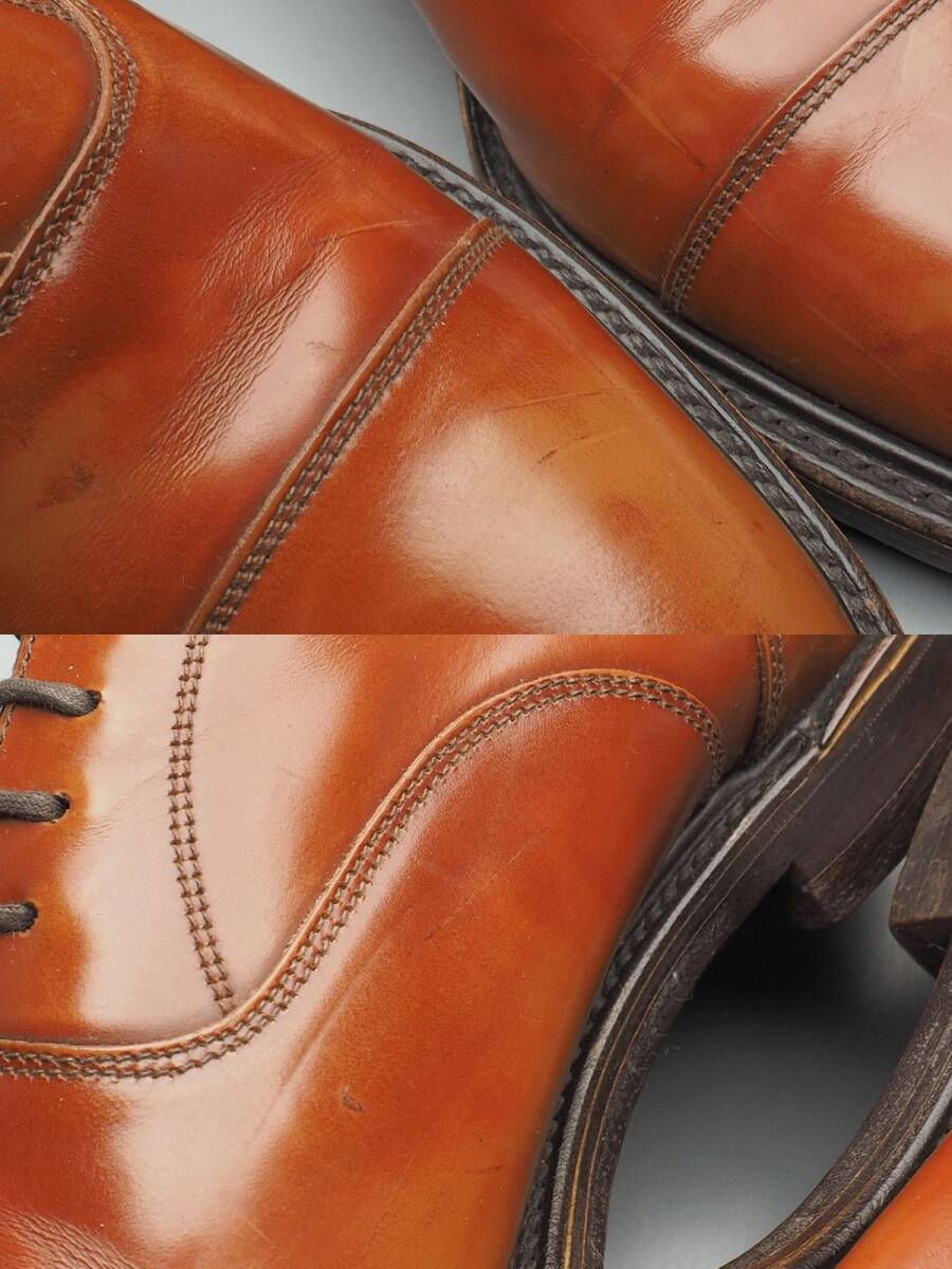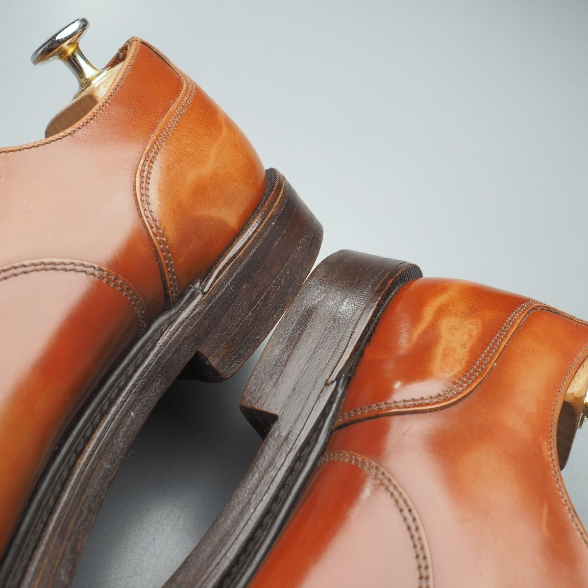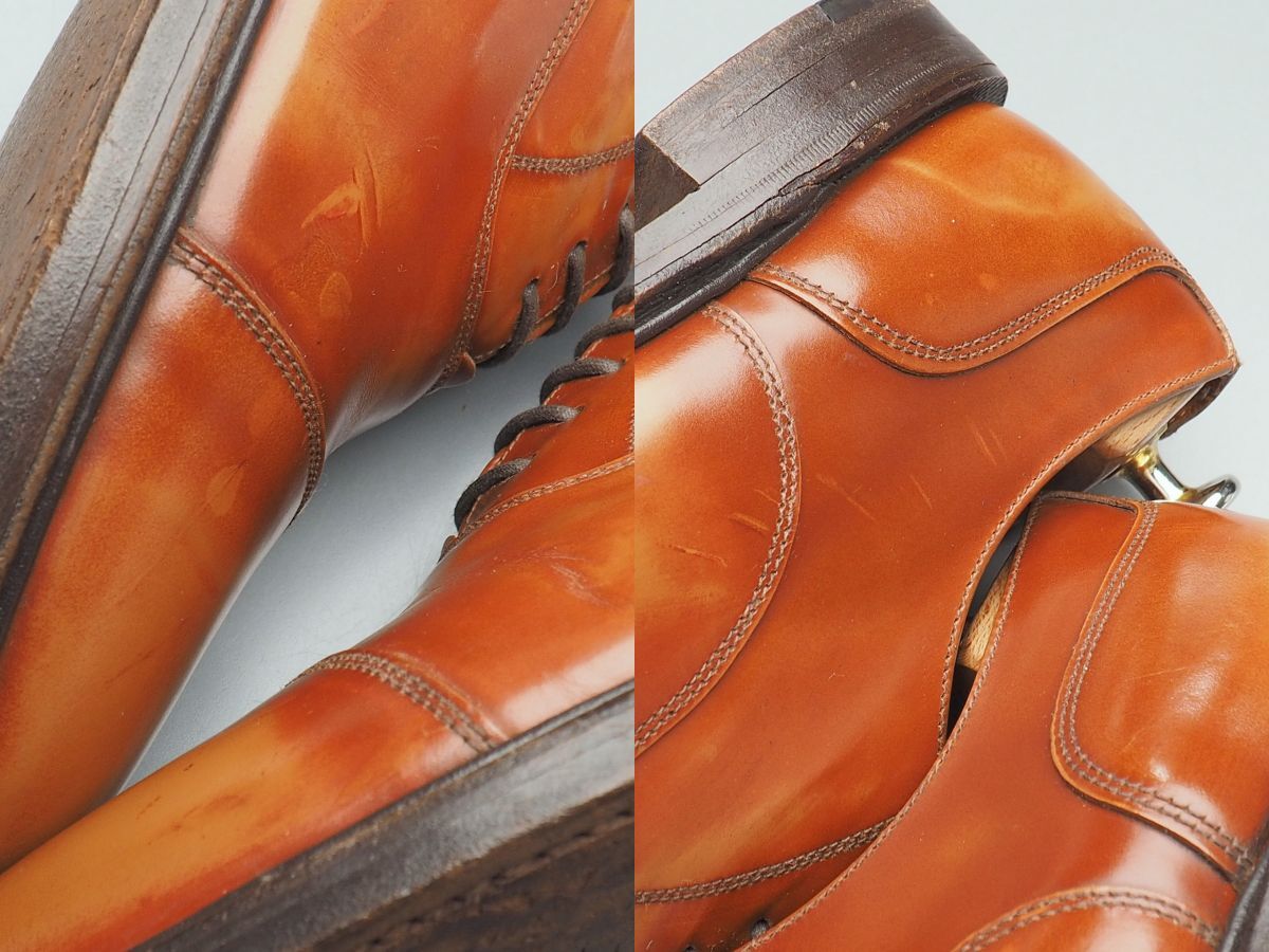 【コンディション詳細】 アッパーのシワ、所々の擦れやムラ、シミや薄汚れ、またインソールやライニングの擦れや汚れが見られますが、その他支障になるようなダメージ等はなくこれからも十分にご愛用いただけるコンディションです。 アウトソールの減りはトゥで2mm程度、ヒールで3mm程度です。 |