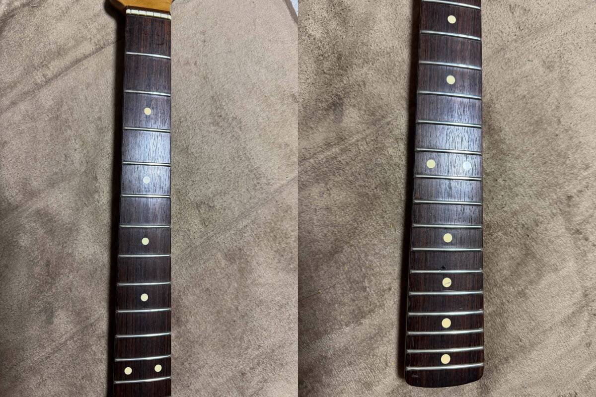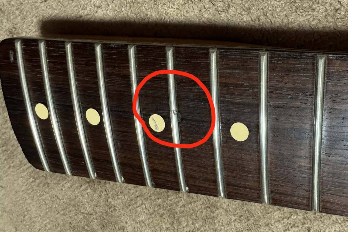 傷やくすみ、汚れはもちろんありますが、画像に赤印をしている箇所、16フレットの4弦あたりに傷があるのですが、