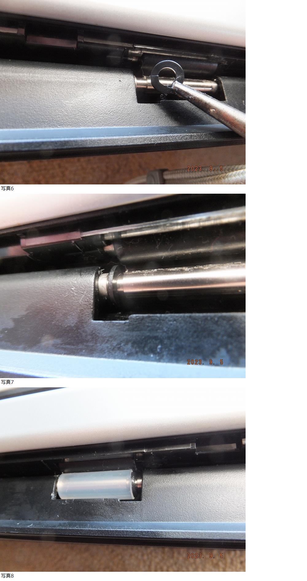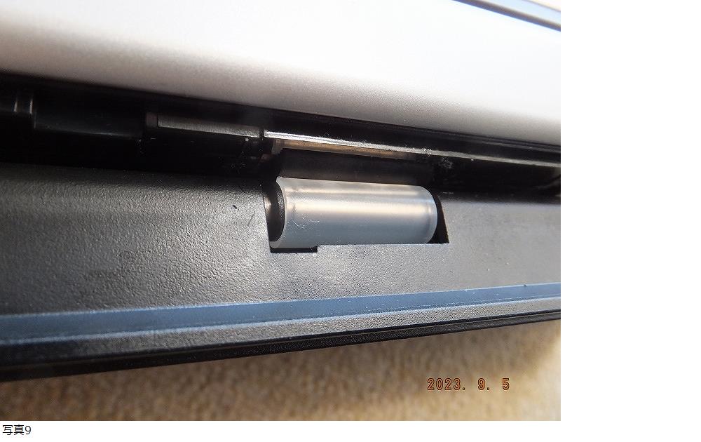 写真6枚目のようにスポンジが付いていた溝にラジオペンチで開いた部分を心棒に押し込むとローラーのずれを防止できます。