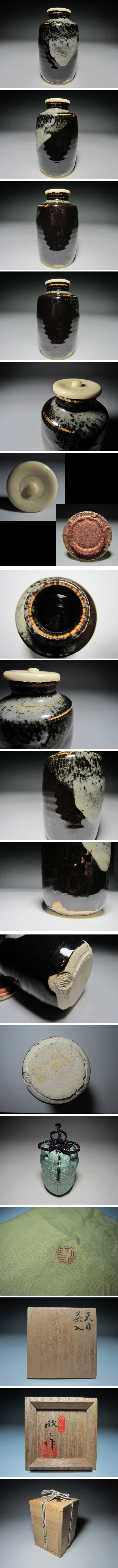 蓋は牙蓋で仕覆と共布が付属します。 美しい釉薬の見ごたえのある品です。 岡本欣三(大正3年~平成13年) 倉敷市に生まれる。父は日本画家の岡本東陽。 京都国立陶磁器試験所で、各種釉薬や焼成法を研究、中国古陶磁の技法の再現に努める。 昭和26(1951)年倉敷に戻り、天神窯を築窯。釉薬の研究を進め、同42(1967)年には玳玻盞天目を完成させる。また紫欣釉、桃寿光など独自の釉薬を開発した。 同47(1972)年岡山県文化奨励賞、同63(1988)年岡山県三木記念賞を受賞。 サイズ 直径5.5㎝×高さ9.5㎝ (多少の差はお許しください) 状態 出品前に検品を致しましたが、疵やヒビ・直しは見られません。 骨董品という事をご勘案頂き、時代経過のスレや、窯疵、小さな傷がある場合があるかもしれませんのでご承知置きください。 画像をご覧いただき、気になる箇所がありましたら「質問欄」よりお問い合わせください。 | |||