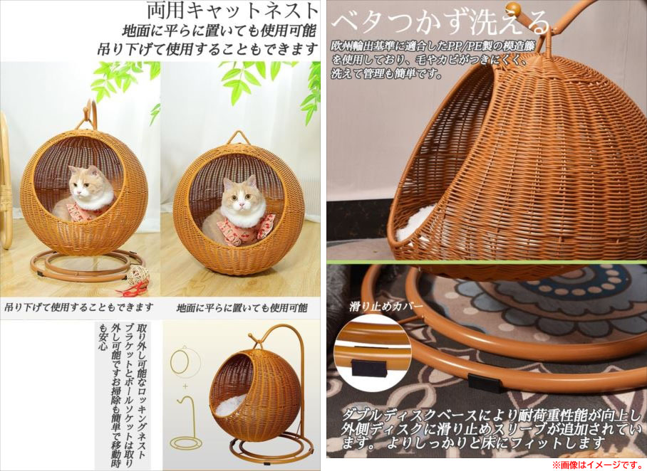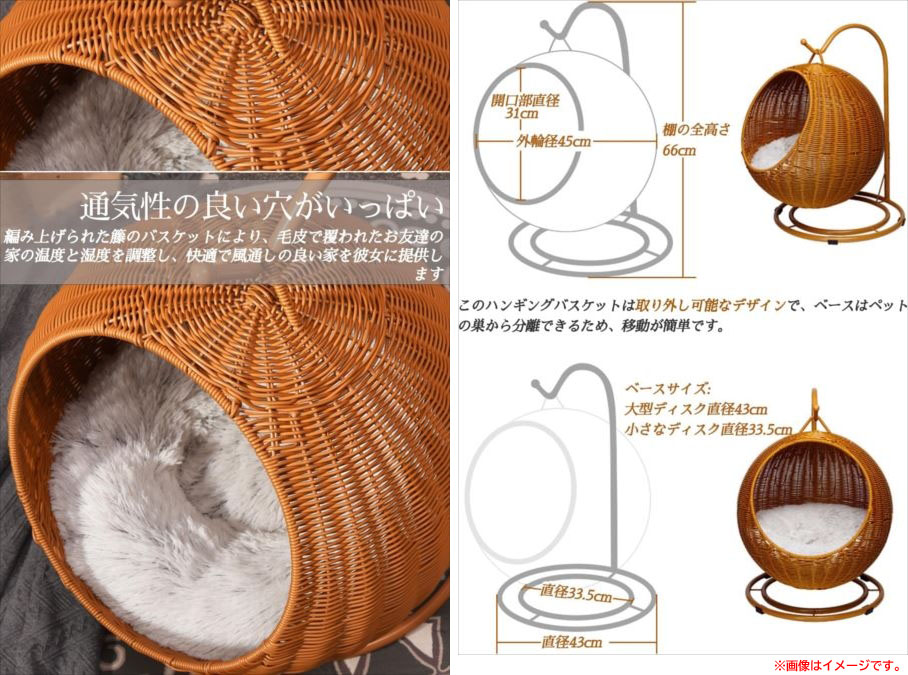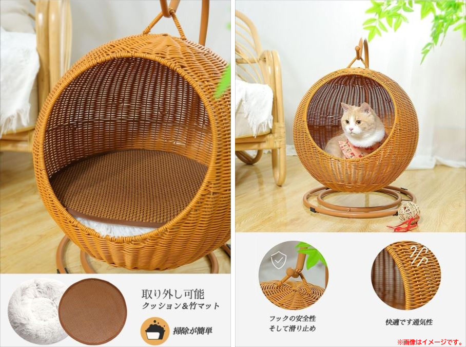 【商品特長】 ◆天然PE籐素材、通気性があり、柔らかく、無臭で、ペットに快適で安全なベッドを提供します。 ◆頑丈な金属支持フレームの構造により、より安定して耐久性があります。 ◆金属フレーム構造と小さな穴の設計により、空気が流れ、ペットの猫の健康、風通し、 涼しさを保ちながら、非常に快適な睡眠環境を提供します。 ◆籐製の猫ベッドには洗濯機で洗える柔らかいコットンクッションが付いており、 子猫がより快適に眠ることができ、お手入れも簡単です。 ◆ハンギングバスケットのおもちゃは猫にもっと楽しみをもたらし、 ペットの退屈を心配する必要がなくなります。 | |||||||||||||
