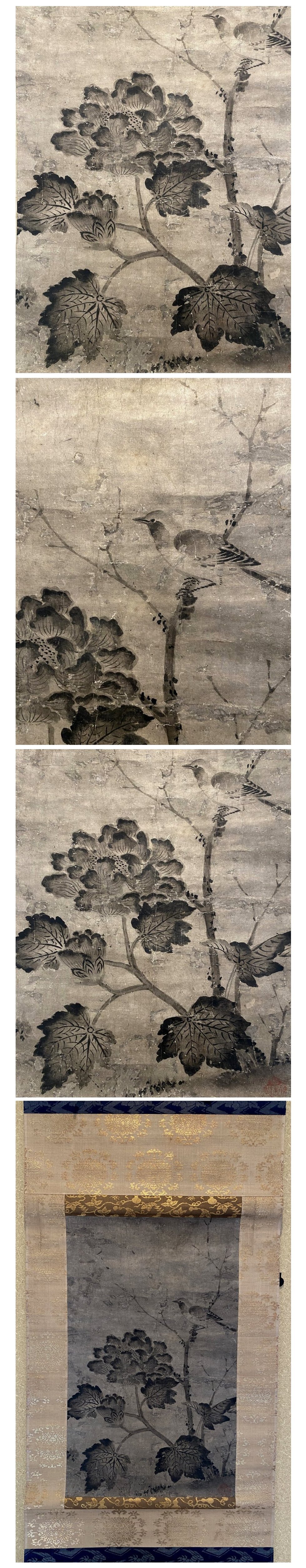 掛軸 紙本 金襴裂の三段表装風帯付き 桐箱