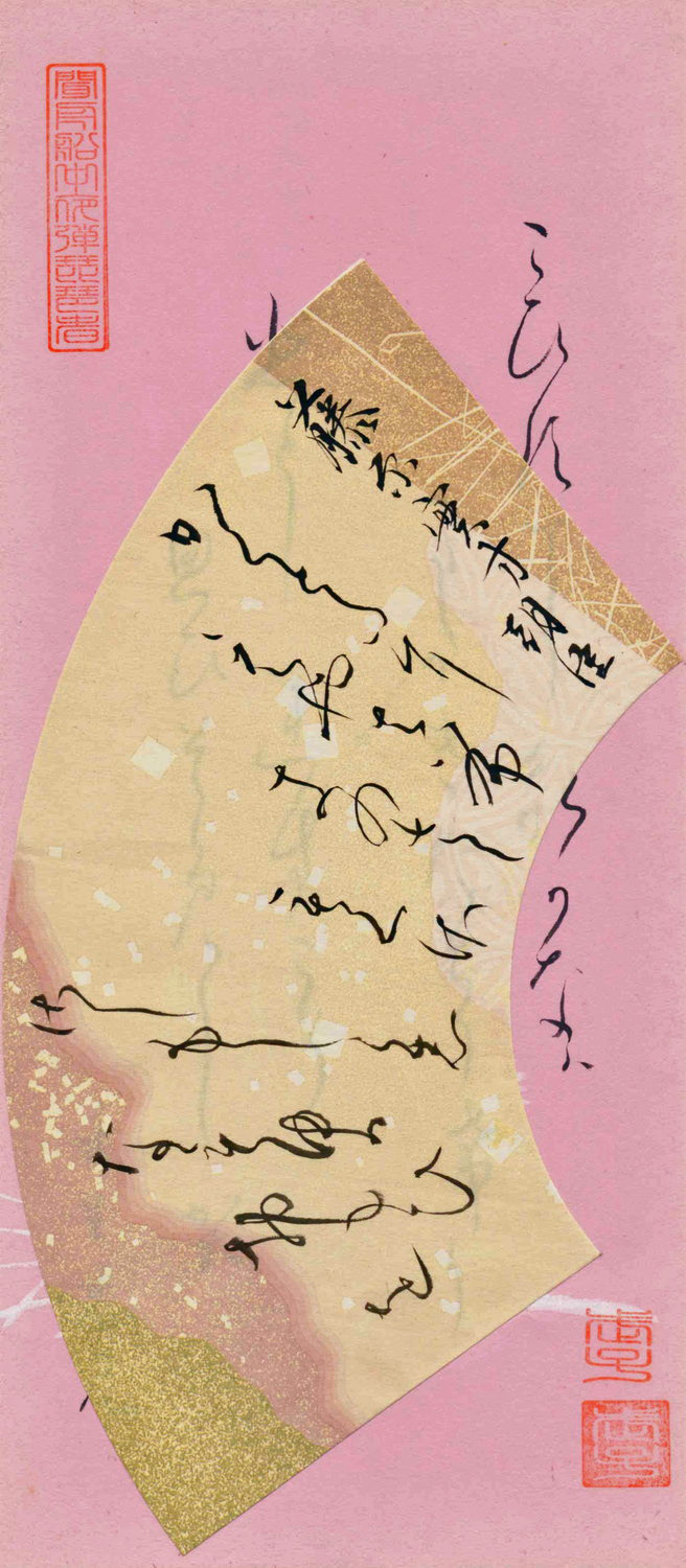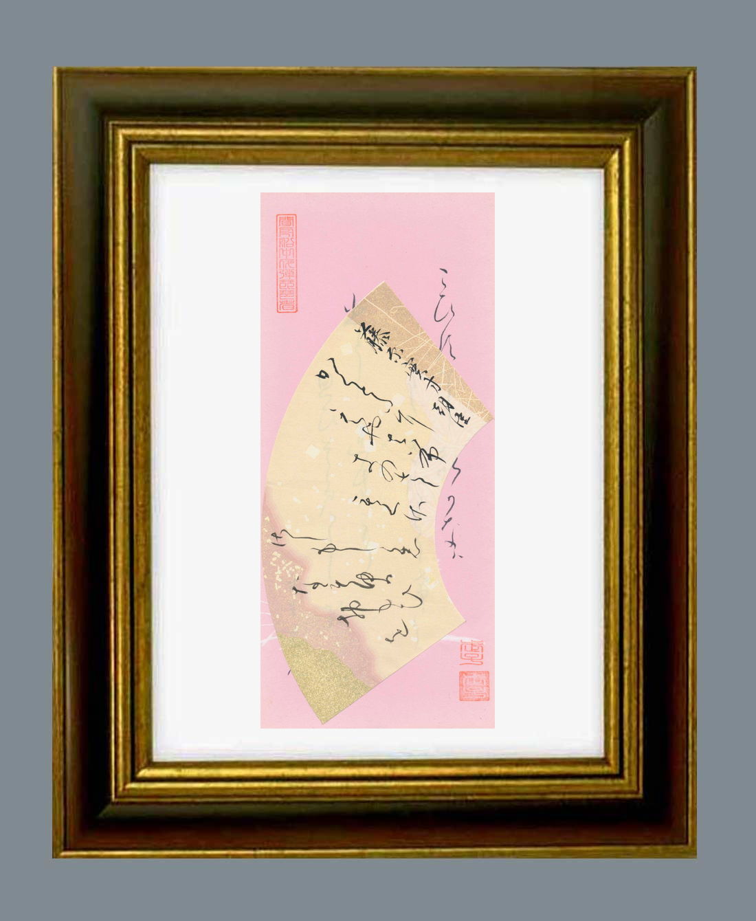 備考・原文は下書の上に扇状の和紙を乗せて上書きされております。下書きは平兼盛の和歌番号41番の和歌「こひ(恋)すてふわかな(名)はまたきた(立)ちにけり 人知れすこそ思ひそめしか」