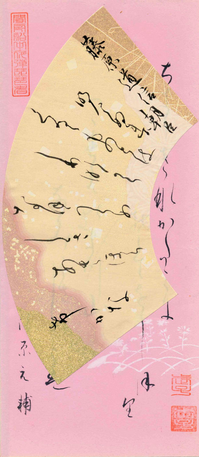 備考・原文は下書の上に扇状の和紙を乗せて上書きされております。下書は清原元輔の和歌番号42番の和歌「ちき(契)りきなかたみにそて(袖)をしほりつゝ 末(すへ)の松山(まつやま)なみ(波)こ(越)さしとは」 和紙が貴重なため扇状の和紙に書いた。