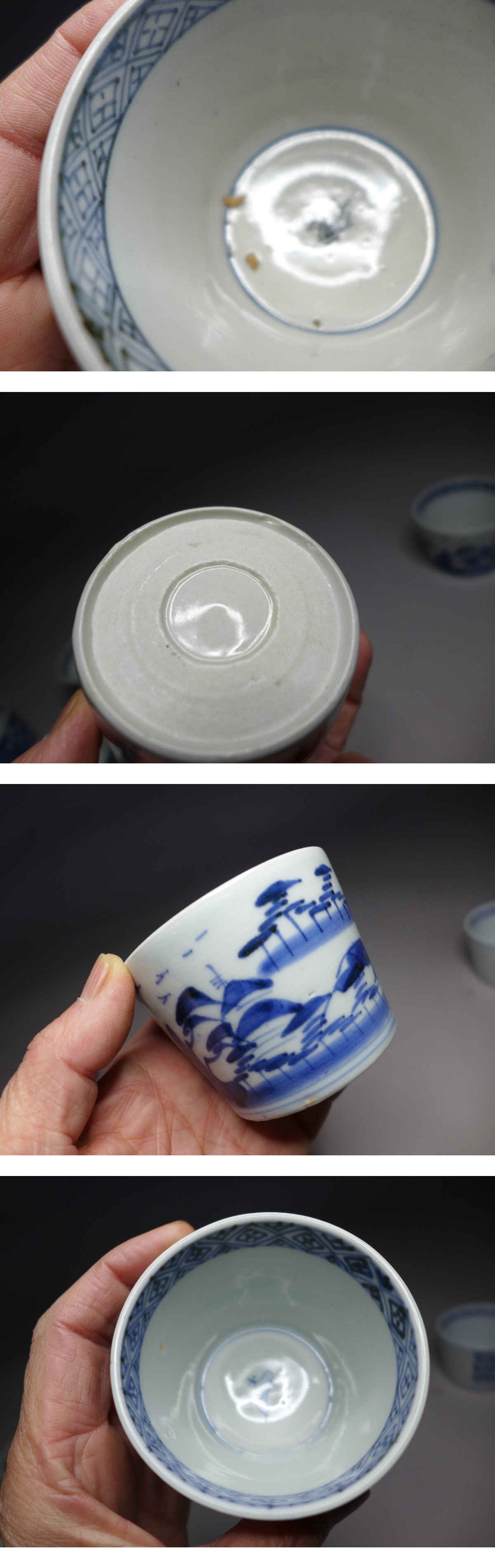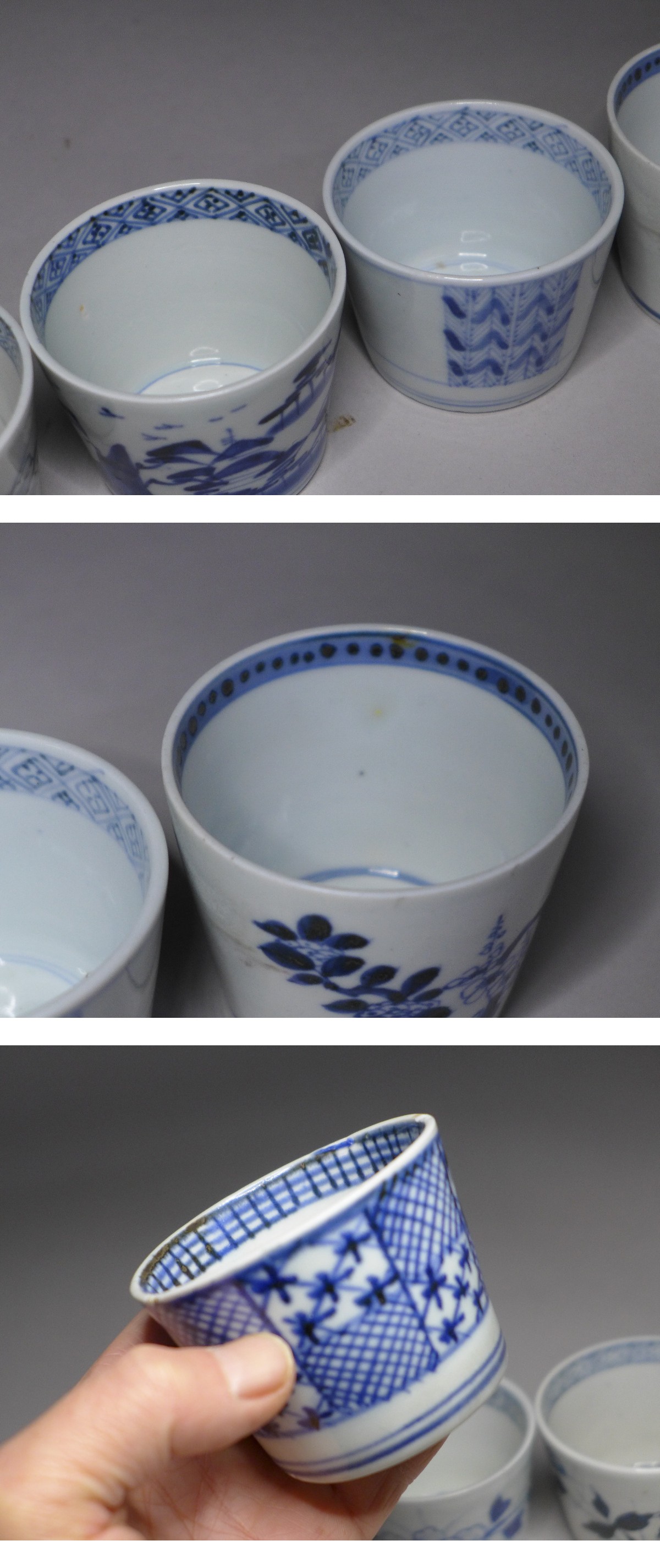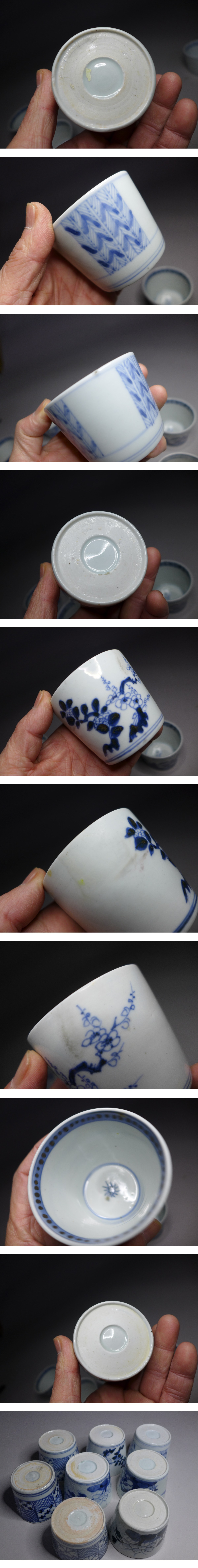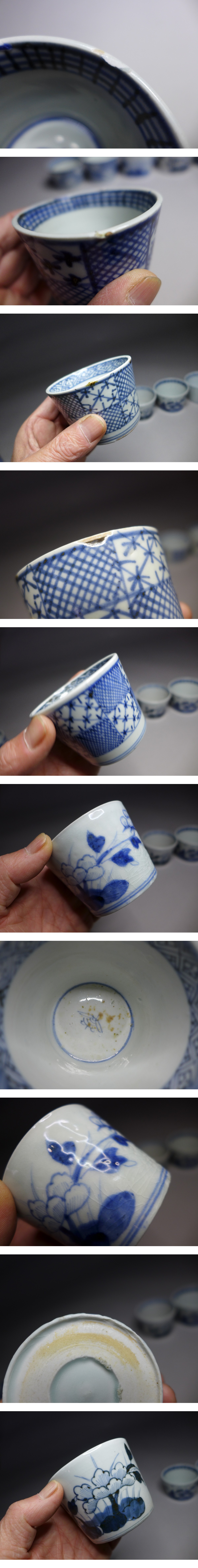 蕎麦猪口⑤『古伊万里染付蕎麦猪口8客』です。それぞれ若干大きさも違いますが、矢羽根文様の高:約5・6cm/口径:約8cm程度です。欠けのあるもの、振り物や甘手物、煙の入ってる物があります。現状品になりますので写真をご確認の上御入札お待ちしています。状態は画像参照でお願いします。※他にも蕎麦猪口出品中です。是非ご覧ください。★★★★★★★★★★★★★★★★★★★★★★★★★最近、悪質な入札者が多く非常に迷惑をしております。新規IDや「非常に悪い・悪い」の評価の多い方の入札はお断りさせて頂きます。 仮に入札があった場合でも、発見次第入札を削除させて頂く場合がございます。