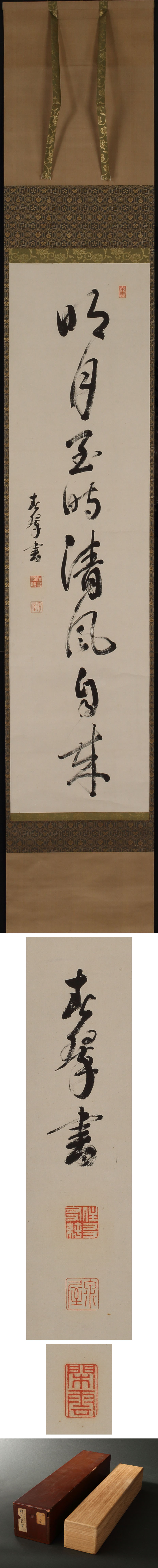 住友春翠の八字一行物です。 「明月時に至り、清風自(おの)づから来たる」と訓じます。司馬光『独楽園記』を典拠とする禅語で、清らかで落ち着いた隠遁の境地を言い表した句です。 社会事業にも関心を寄せた関西の近代数寄者が遺した逸品です。 某数寄者研究者の旧蔵品です。 ◆住友春翠 明治-大正期の実業家。徳大寺公純の6男。西園寺公望の弟。明治25(1882)年住友家にはいり,翌年15代をつぐ。28年住友銀行を創設するなど各種事業を経営,三井,三菱とならぶ財閥の地位を確立した。貴族院議員。大正15(1926)年没、63歳。京都出身。幼名は隆麿。通称は吉左衛門。号は春翠。 付属:時代箱・二重箱が付属します。 寸法:高さ210cm、幅33cm(最大幅。若干の誤差はご了承下さい) 状態:折れがございます。 |