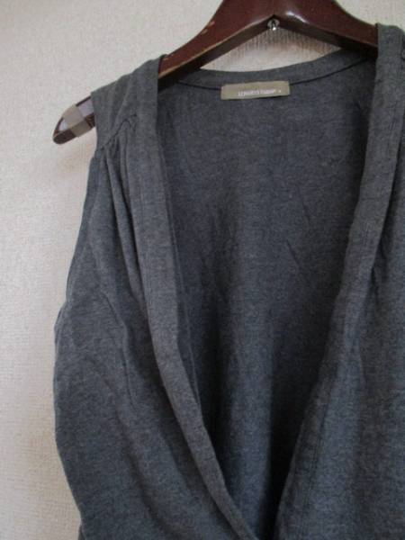 | 商品紹介 | グレーのベストです。 前の裾と肩の内側にスナップボタンが付いていて、ボタンを留めることで短くでき、 取ると前を長く垂らして着ることができます。 素材はカットソーで、肩の所にギャザーが入っています。 《素材》 コットン100% |
