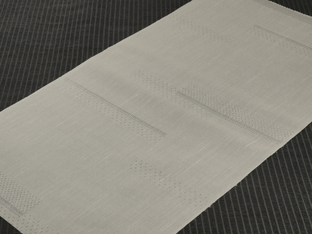 灰白色 (かいはくしょく)の地に、大小の幾何学的な絣でかたどられた角の文様が織り込まれている夏紬のはぎれです。透け感があります。 未使用保管品ですが、残布のはぎれです。若干の経年によるくすみなどはあるかもしれませんが、目につくしみやよごれ、褪色などのダメージはなく、ほぼ新品同様にきれいな状態です。※風楽の出品内で同じ柄のものを複数出品している場合もあります。 |