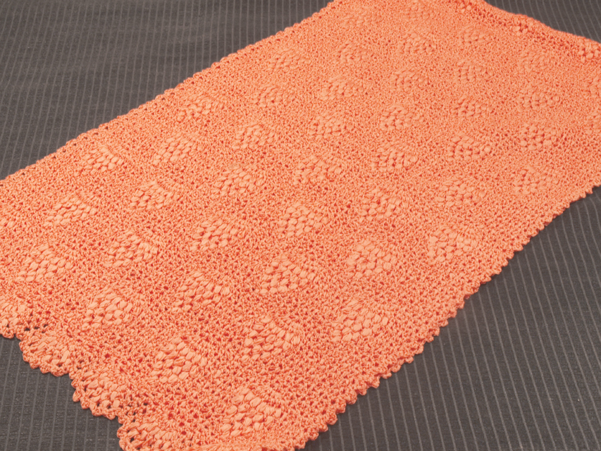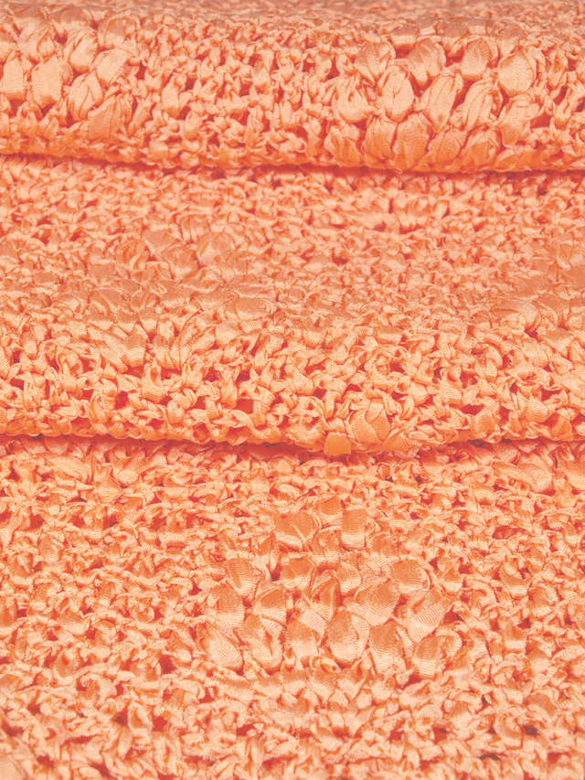 淡い鉛丹(えんたん)色の地に、葡萄の文様が編み出された、リボンレースのショールです。 ユーズド品で、使用感はあまり感じられませんが、中央に直径約 2cm の範囲でうすよごれが 1 か所ありますが、ほとんど判別はつかず、そのほかに目につく大きなしみやよごれ、褪色などのダメージもありません。 |