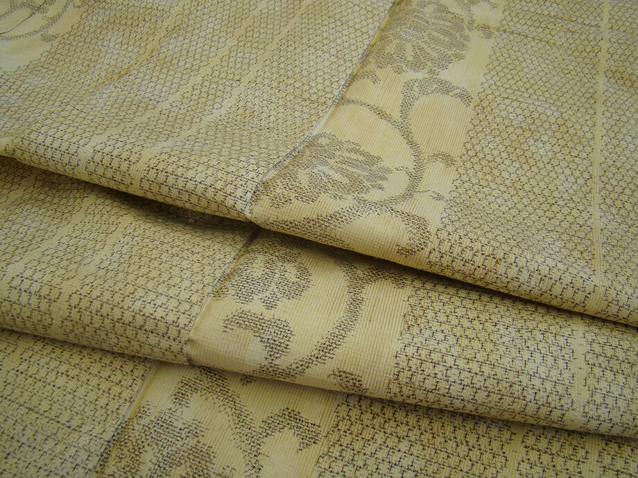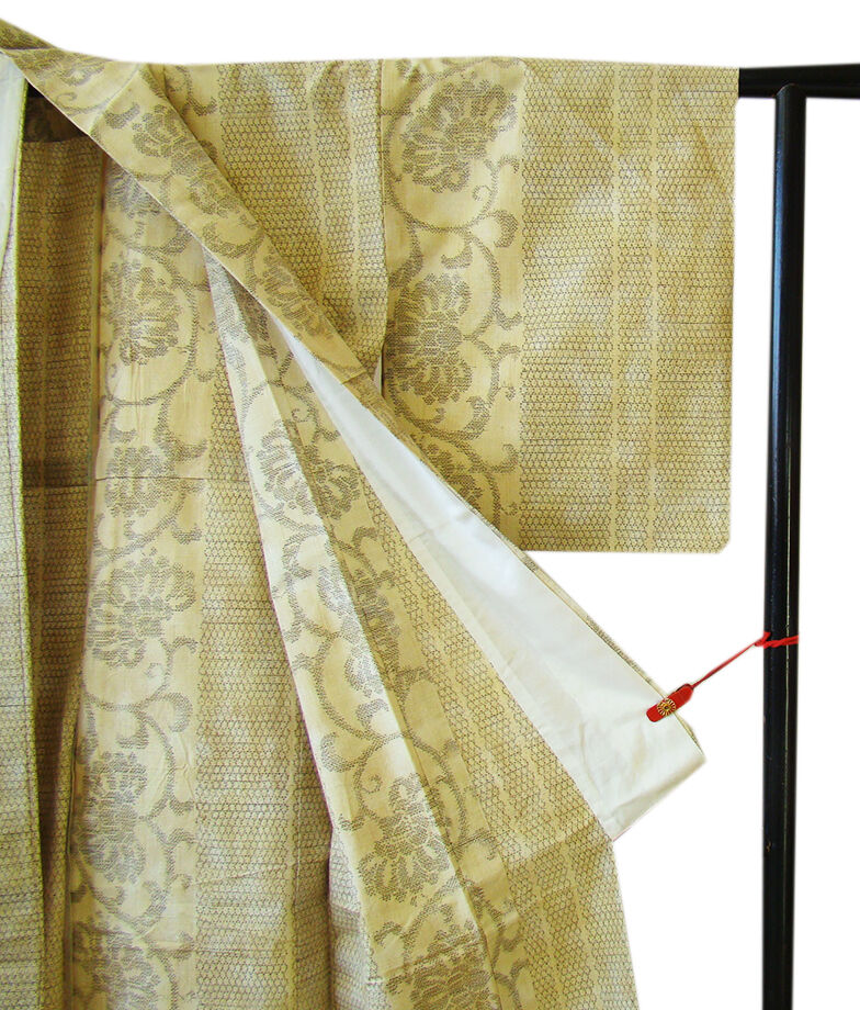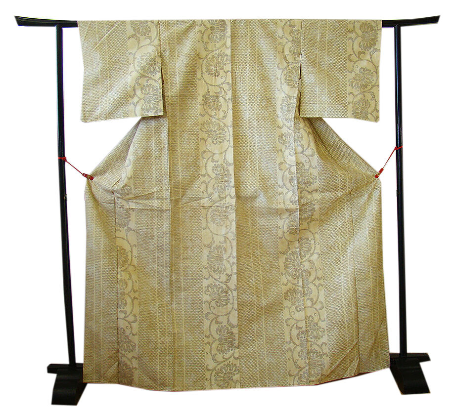 | 商品説明 | こちらのお品は「単衣」ですので5月、6月、9月にお召頂ければと思います。 着物には、大きく分けて「袷(あわせ)の着物」と「単衣(ひとえ)の着物」と「夏着物」があります。 反物(表地)を着物に仕立てるときに、裏地類をつけるものを袷の着物、 つけないものを単衣の着物と呼び、胴裏や八掛といった裏地がつかない一枚ものの着物です。 また裏地がないため、座る時などにヒップのラインが目立たないよう、 居敷当て(いしきあて)の生地をつけることもあります。 居敷当ては付いておりません。 とてもしなやかなふっくらとした柔らかな手触りの着心地良い単衣仕立ての紬地、 渋い白橡色地に黒色の花唐草柄の織柄が粋な着物姿を演出しております。 |