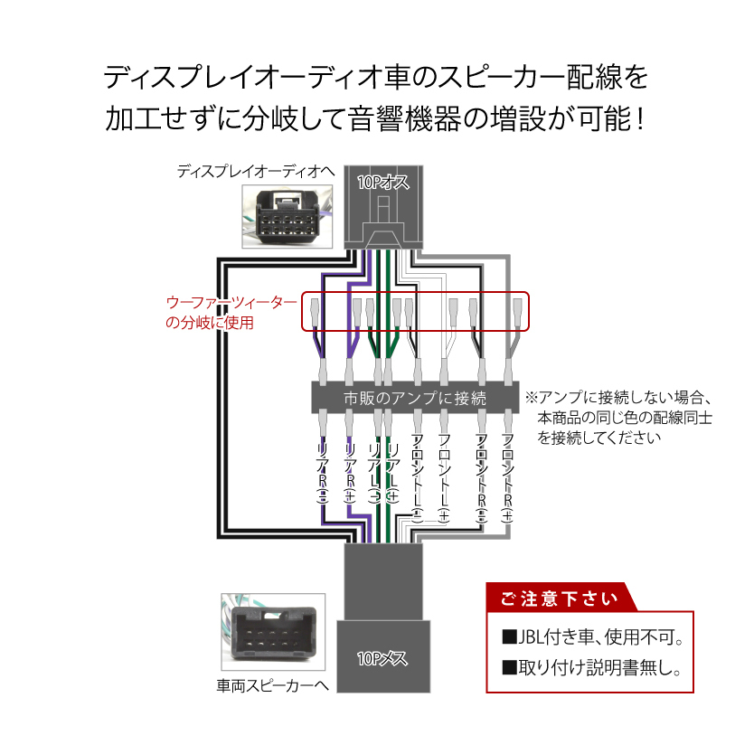 | ディスプレイオーディオ車のスピーカー配線を 加工せずに分岐して音響機器の増設が可能! 9インチディスプレイオーディオ付車に適合。 【確認事項】 ※アンプを接続する場合はハイレベルインプット仕様のアンプに接続して下さい ※RCA入力しかないアンプは別途Hi/Loコンバータをご用意下さい ※JBL付き車、使用不可 ※未使用の配線は必ず絶縁して下さい ※取扱説明書はございません ※必ず現車でコネクター形状をご確認の上、ご購入下さい |