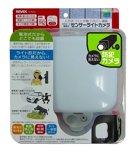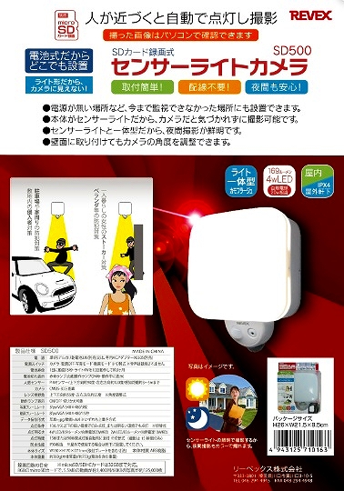 侵入者やストーカーを感知するとライトが点灯し、その場でmicroSDカードに自動録画します。