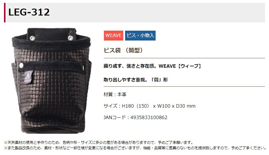 ふくろ倶楽部WEAVE(ウィーブ)シリーズビス袋 (筒型)LEG-312■特長織り成す、強さと存在感。WEAVE【ウィーブ】取り出しやすさ重視。「筒」形■仕様材質:本革サイズ:H180(150)× W100× D30mm※天然素材の使用と手作りのため、色柄や形・サイズに多少の差がある場合がありますので、予めご了承願います。※また製品改良のため、素材・形状など一部仕様が変更になる場合がございますが、機能・品質等に差異のないものを提供致しますので、予めご了承ください。