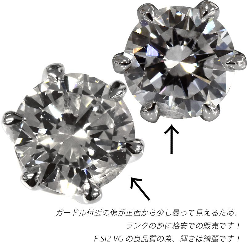 | コメント | 無色のカラーF、カットも良質なVGのため、パッと見は細かく強い輝きが綺麗なダイヤモンドです。 ただ、SI2でガードル付近にある傷が正面にも映り込んでしまい、近くでよく見るとその部分だけ少し白っぽく曇って見えます。 そのため、品質の割には格安で販売しています! |