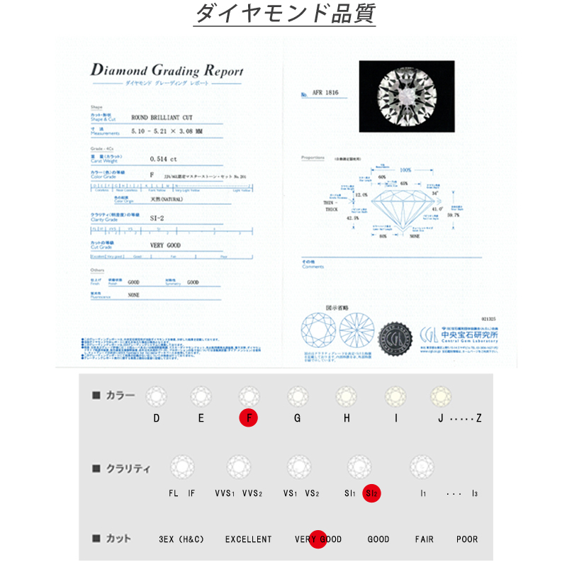 | 品質 | ・0.514ct F SI2 VG 中央宝石研究所鑑定書付き |