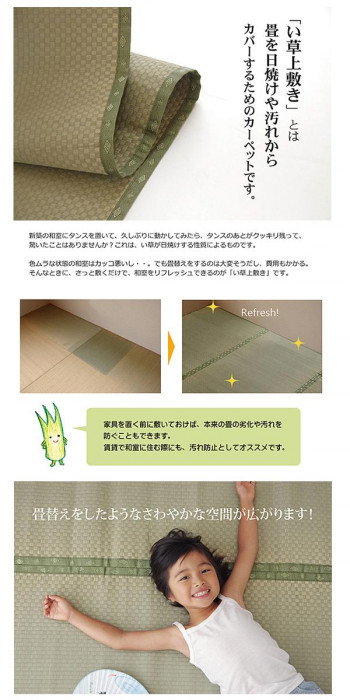 | 上敷きを敷くだけで畳のお部屋をリフレッシュ出来ます。日焼けしてしまった畳のリフレッシュに、新品の畳を汚さないためのカバーにご使用下さい。 ※自然素材であること、また職人が一つ一つ手作業にて加工を行うため、形状のバラツキや表示サイズと多少ことなることがあります。ご了承下さい。 ※写真は表記サイズと異なる場合がございます。 |