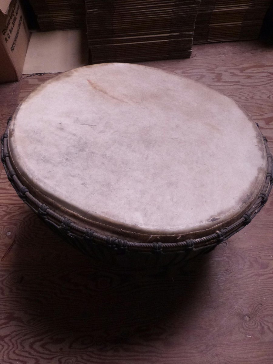 かれこれ20年以上前に現地のミュージシャンから購入したものです。ジェンベでもなくドゥンドゥンでもなく見たことのないドラムでした。マリ共和国のSEGU地方で昔から使われている太鼓とのことです。エッジ部分に虫食い穴がたくさんありますが、古いですので原虫はいないと思います。