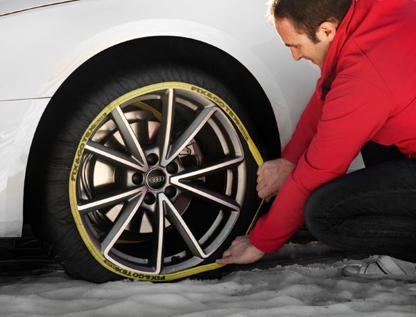 | 取付方法 | 装着するタイヤの上側より商品を被せられるだけ被せ、車両を動かしタイヤを半回転させます。 タイヤに被せていない部分が上側にきたら、先程と同じ様にタイヤに被せるだけです。 方向性もございませんので短時間でのお取り付けが可能です。 取り付け時に製品全体がタイヤに被っていたら、走行することで適切なポジションにおさまります。 |