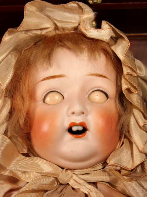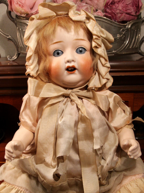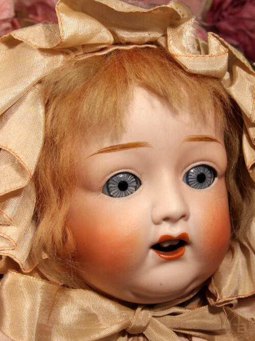 | サクラビスク シノダ 青目 44cm シノダのとても大きなサイズの子。サクラビスクは30cm超えるサイズは 珍しいですがこの子は44cmもあり存在感抜群です。 お顔もかわいいです。 ウィッグはヘッドに接着されています。 ヘッドの確認出来る部分にダメージはありません。 ウィッグはボンネットから出ている部分は経年により変色しています。 ボンネットにかぶさる部分は淡いオレンジ系の色をしています。 瞳は青目で放射状に虹彩が入っています。 スリーピングアイで滑らかに動作します。 左目のまぶたに小さく表面的なはがれがありますがほとんど目立ちません。 ボディは目立ったはがれなど無く、わずかにシミなどが見られますが 全体的には良いコンディションです。 お腹に鳴き笛が入っていますが動作しません。 ゴムは引き直ししてありますが足が少し緩めです。 ドレスとボンネットはオリジナルの物ですが 経年による汚れやシルクの経年劣化で崩れている部分があります。 とても珍しいサイズのかわいい子です。 グラスアイ(スリーピングアイ) オープンマウス 桐塑胡粉仕上げのボディ 約44cm
